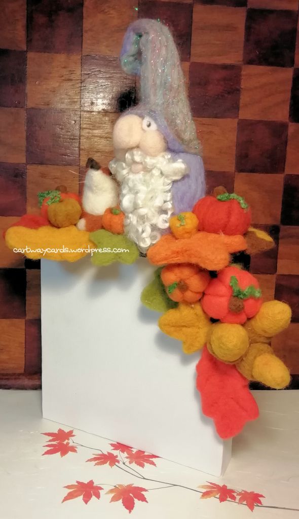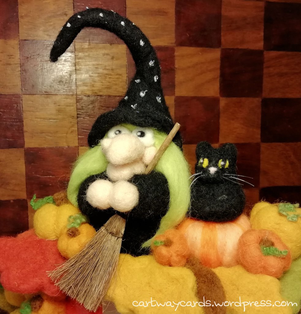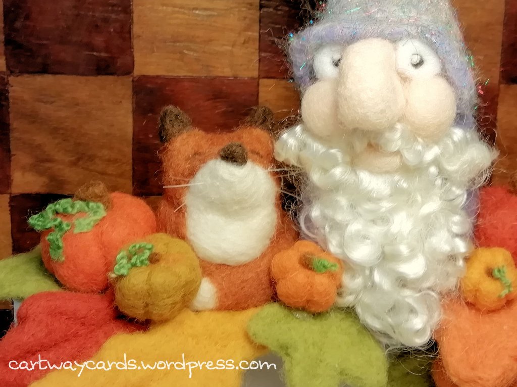 Both characters have a familiar, the little black pumpkin kitty and the smiling fox! I used the normal needle-felted gnome style to create both the characters. Little broom stick I think is an embellishment from Tim Holtz!