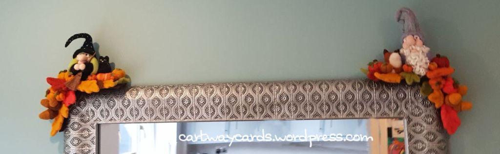 I made a corner from cardboard, painted it with brown paint and then added some felt pieces to hide the workings. I wanted it to slide onto the corner of a mirror and be self-supporting and easy to use! They work a bit like photo-corners (from the olden days, lol).