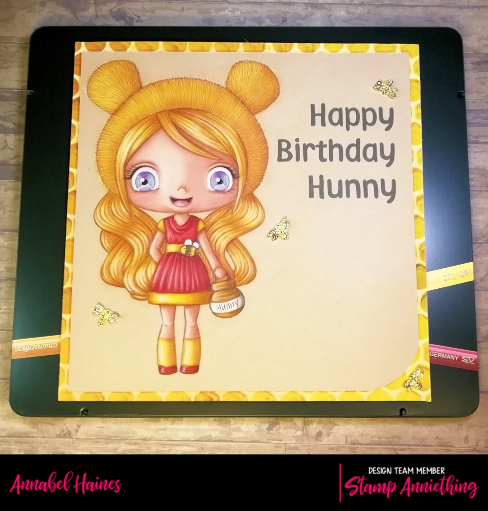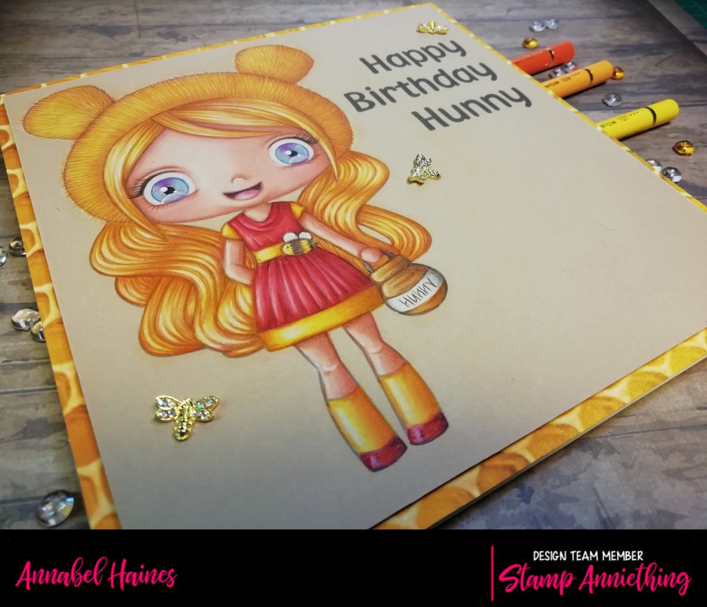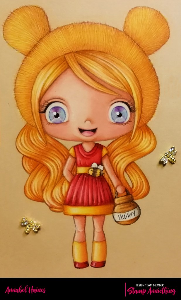 So she is coloured with polychromo pencils and some white posca pen for the brilliant white highlights. I often change my hair technique, just went for something smooth and honey like this time. I used my fur technique on her bear hat. Hopefully there will be video fur tutorial soon, hang on in there 🙂