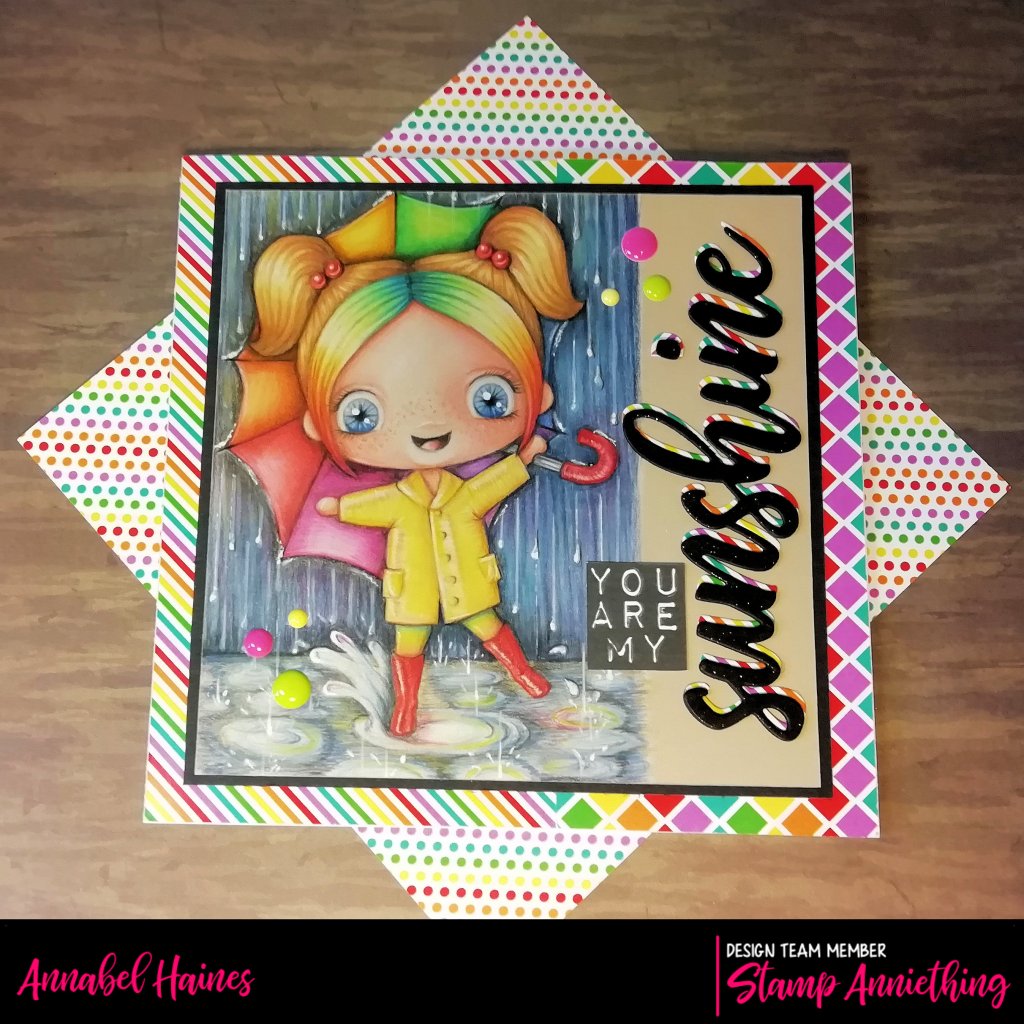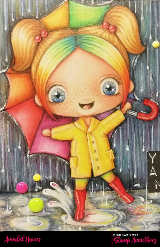 The whole scene is coloured with polychromo pencils on kraft card. I think I used every colour I own, so I haven’t listed the colours I used. All of them! I decided she needed, more puddles, more rain, more rainbows and a brolly! 😀
