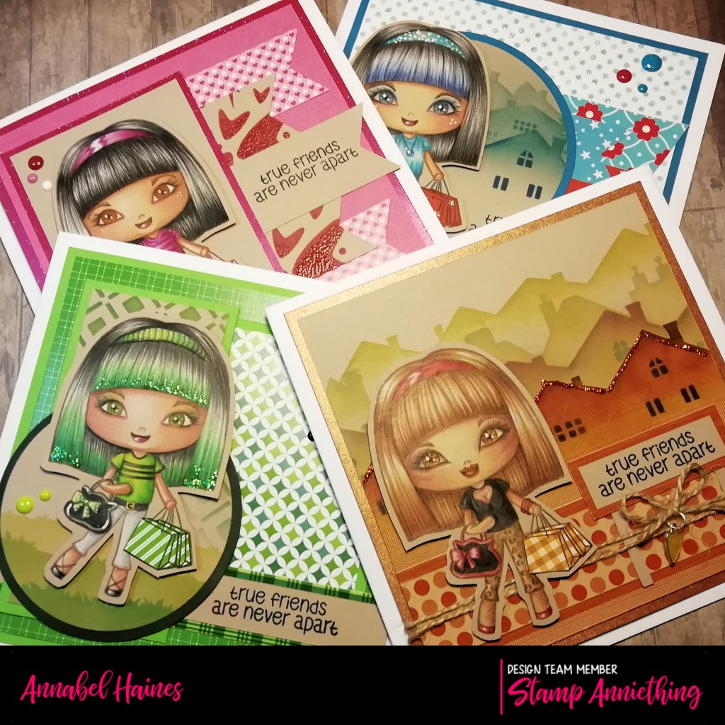 For today’s live I am colouring eyes! And I want to show you some speedy options for pencil coloured eyes you can use with all your Stamp Anniething Stamps. I used these techniques to colour the eyes on all my Mei Yin – Our Friendship is a Gift Stamp on my cards below –