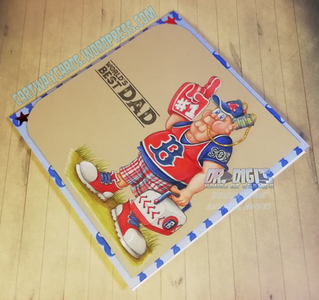 Topper: On the PC make a topper image (16 cm x 16 cm) using Sports Fan Dan digistamp and sentiment from Father’s Day Sentiments Sheet. Resize elements to fit.