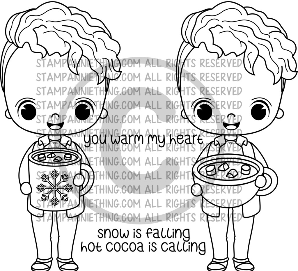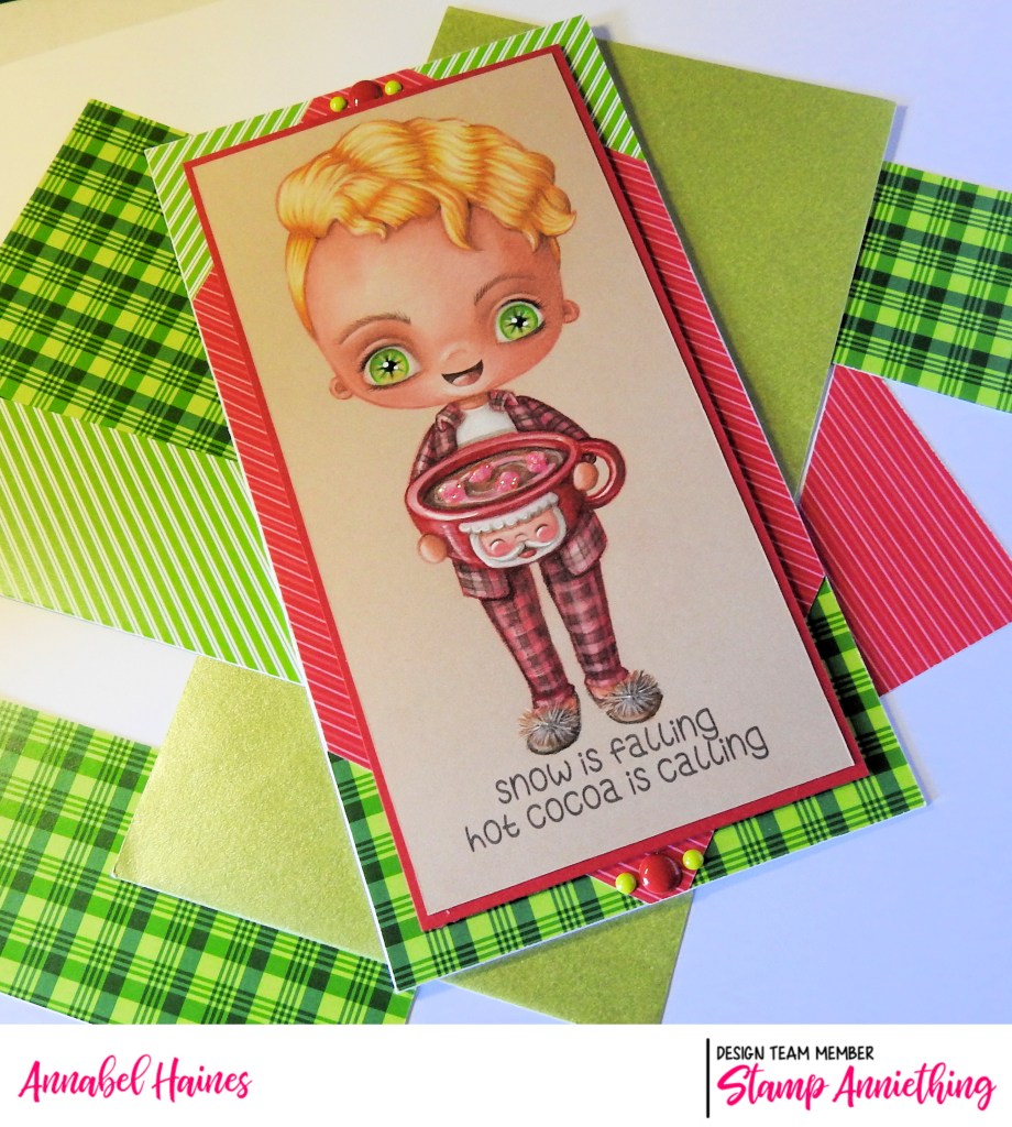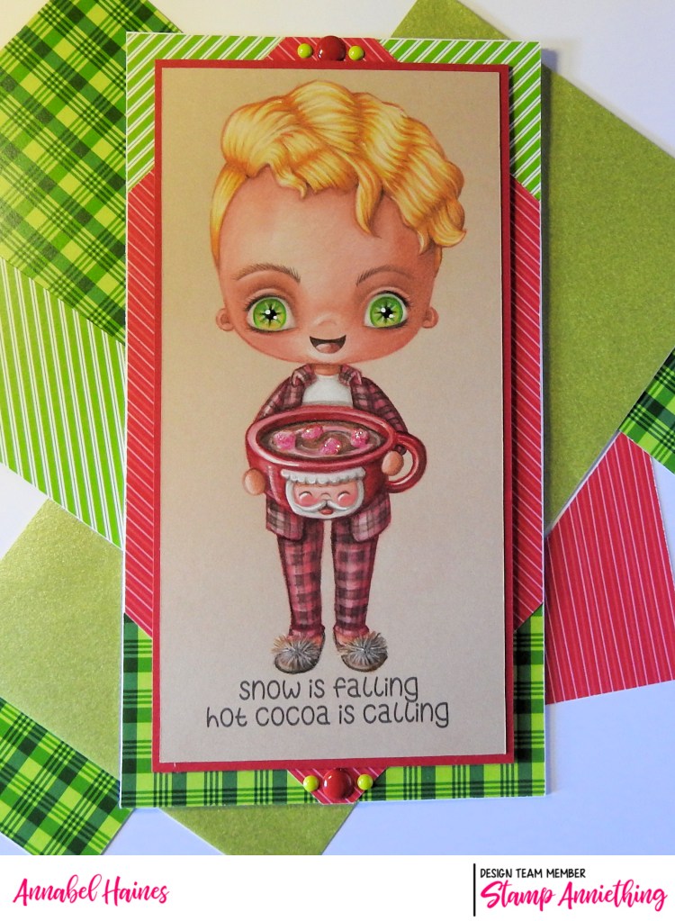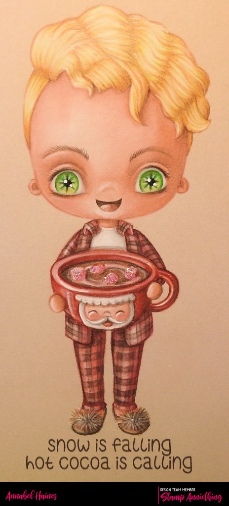 Hi again! It’s my DT day and I selected “Cocoa is Calling” a digistamp from the Stamp Anniething Shop! This is him with the round cup! Which I upgraded to a Santa mug! 😀