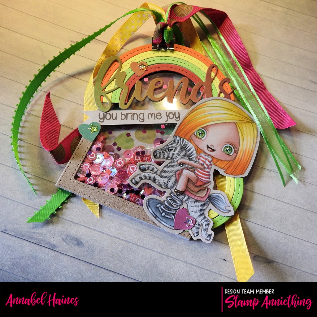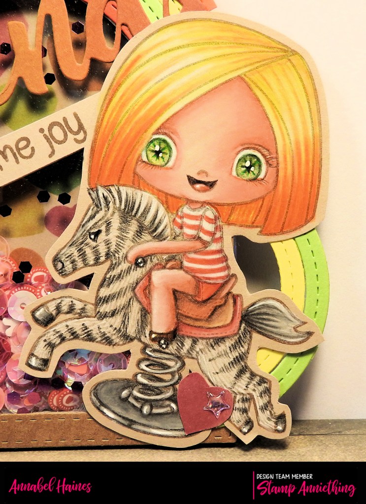I coloured her up with polychromos and then added some highlights with posca pen. Then I made a shaker tag using the Shaker Basics Set (2) from SA.