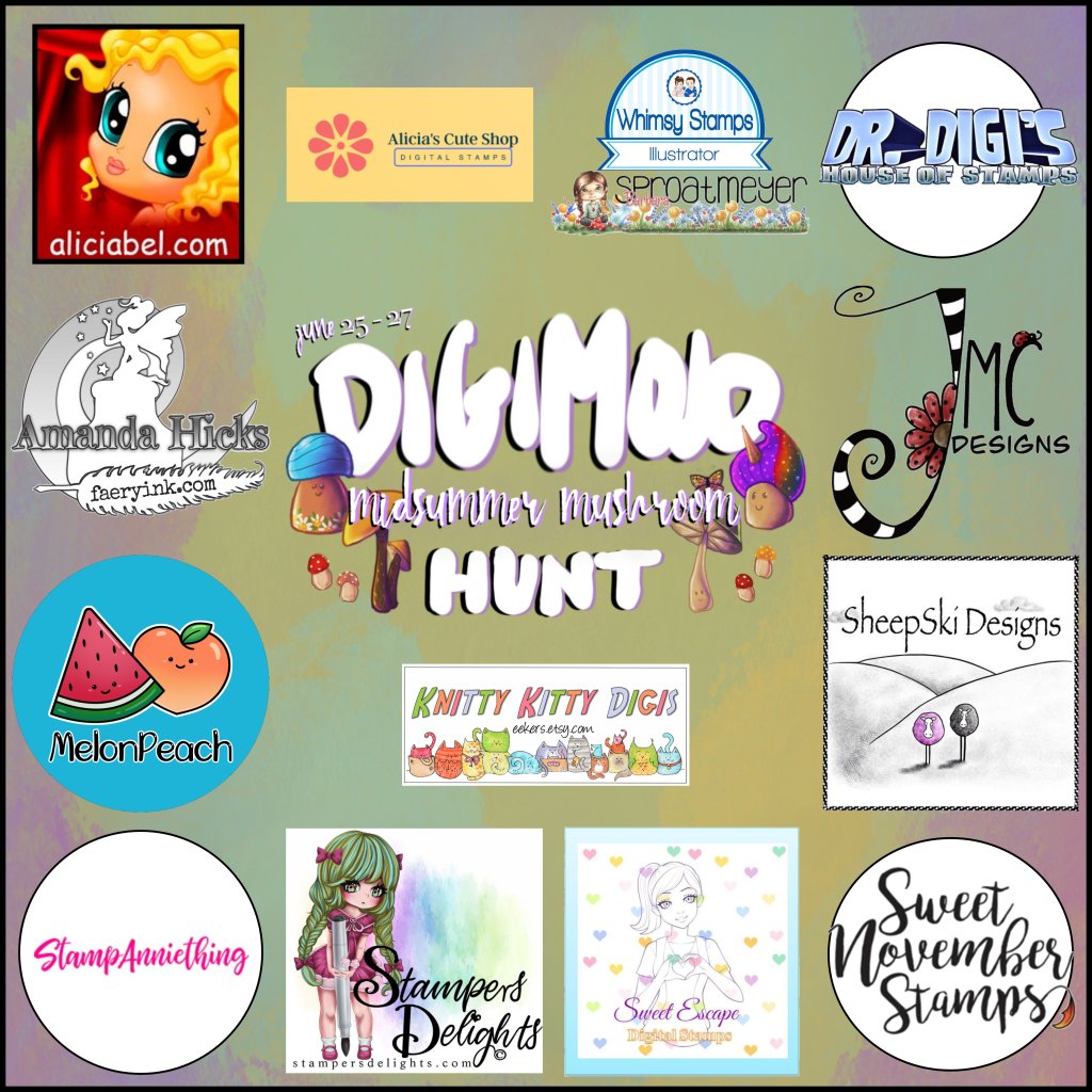 Here in two capacities today! Firstly it’s Dr.Digi Friyay! And also starting at 10 p.m. UK time it’s the Midsummer Mushroom Hunt at Digimojo, and Dr. Digi is one of the sponsors! So I can share with you a sneak preview of the digistamp he will be sharing for free today – Gnome Sweet Gnome! Take part in the event to get your free version!