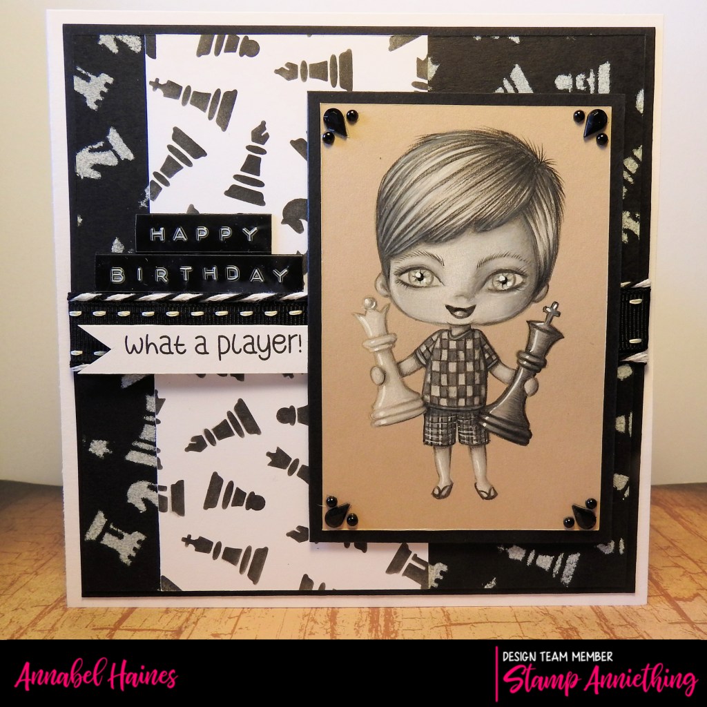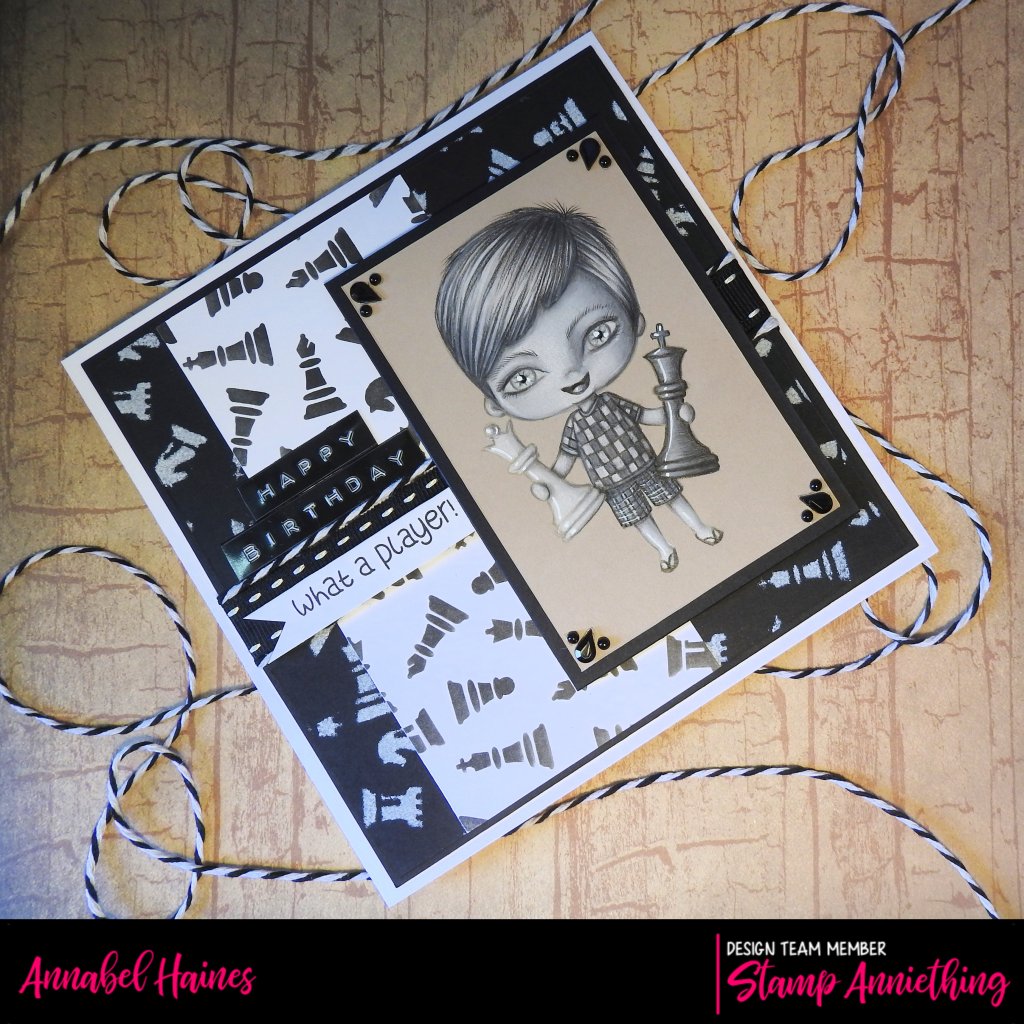 Hi All! It’s a Stamp Anniething day today and I am sharing the chess themed birthday card I made for my SO 🙂 He is a big chess fan and I was super excited that Stamp Anniething has a stamp and stencil that I could use for his card! This is Liang Checkmate and the Chess Stencil.
