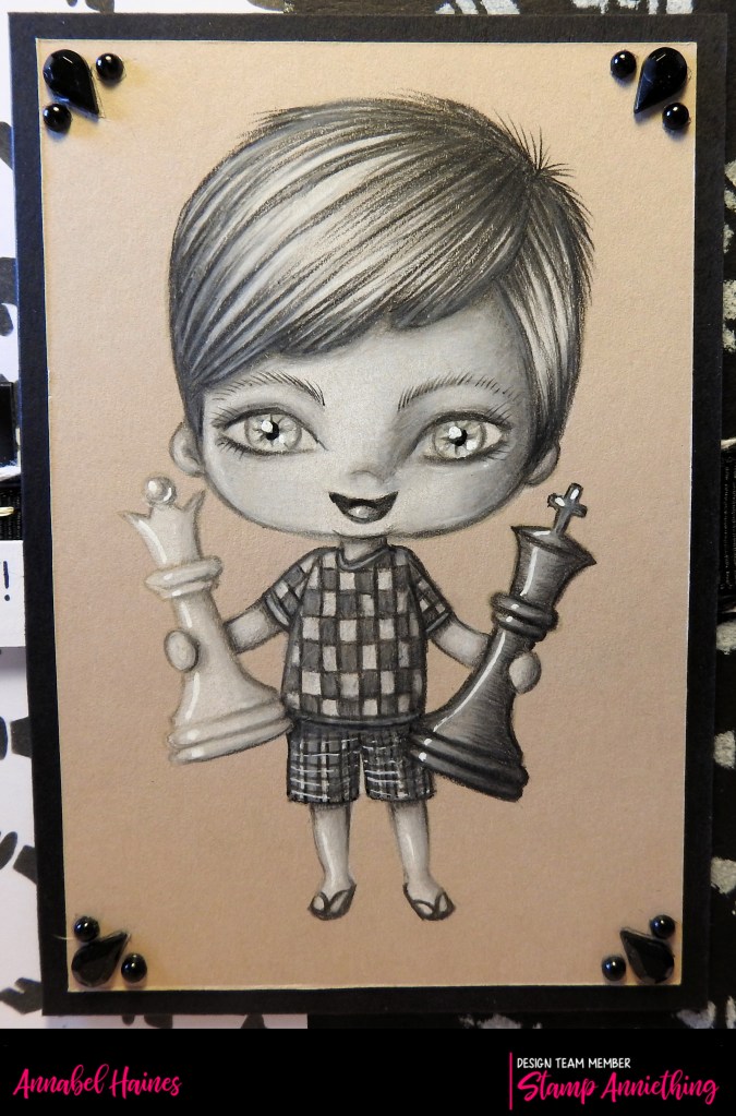 My SO might be a player in the chess sense of the word, but not in the other sense, I hope, lol! I decided to do a black and white theme, apart from the kraft card, I just forgot to stamp it out on white, such a fail, lol! As normal I used the SA Birch Hybrid Ink so I could do a no-lines style colouring.