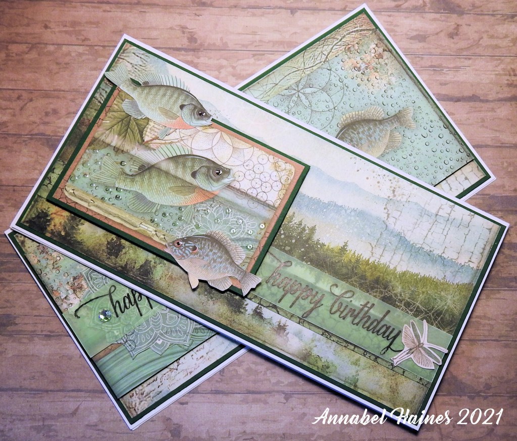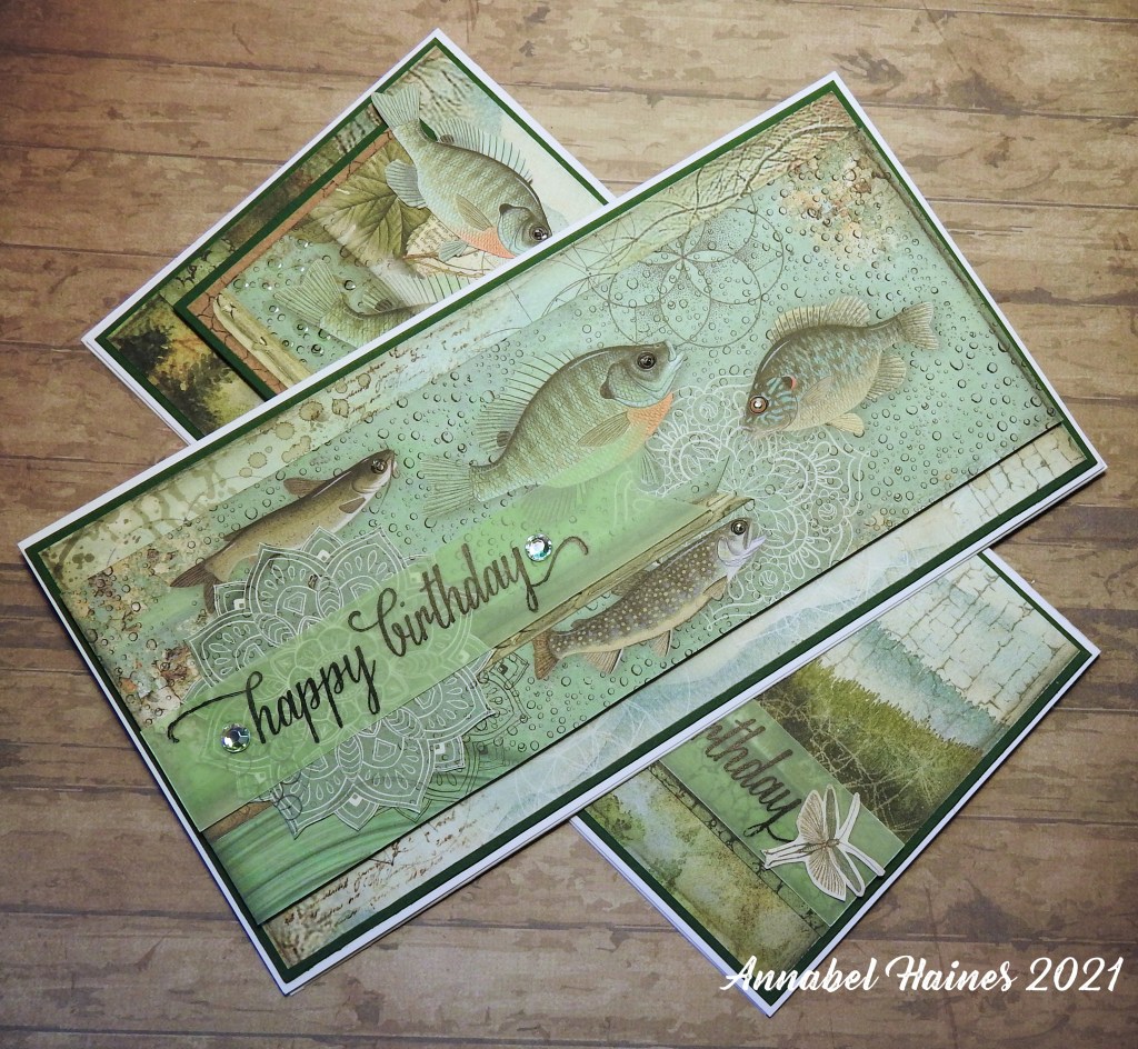 Hi! This is another catch up post, though I only made these a couple of weeks ago. I received the Stamperia Forest Paper Pad for my last birthday and I finally got a free afternoon to mess about with it for a bit! I made two fish themed (or fishing themed?) long thin cards, DL size.