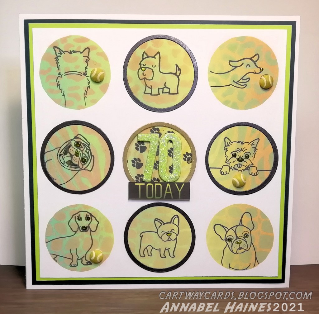 So this was a commissioned card for a dog loving 70 yr old man! I wanted to try stencilling through a stencil too, so to start, the 3×3 circle grid is a homemade stencil. I did my first ink layer in greeny distress oxides through the circle stencil. I then used various stash stencils with amber distress oxide over the top of that circle stencil, so you can only see the patterns in the circles. So double layer stencilling!