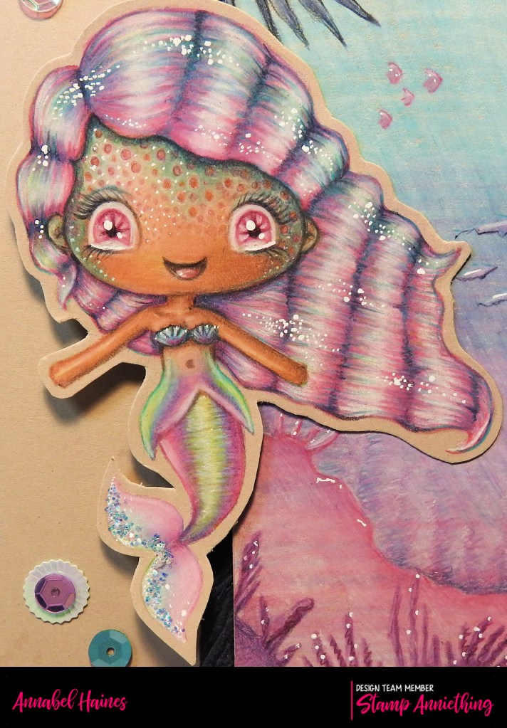I added some stickles to her tail and some sequins from the stash to the card. She does come with a matching die set, but I didn’t have that bit. She wasn’t too tough to cut out though 🙂
