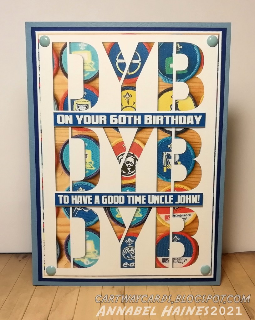 Another quick post because this card was very simple, but I think it worked out well. I make a fair few scout related cards so was happy with a new idea of using the old “dyb, dyb, dyb” cliché. It would have actually been pretty speedy to make using the electronic cutter, but for some reason I made the white stencil letter by hand, printing and cutting them out. I printed it backwards so there would be no ink marks visible from the front. Then I used the stencil over a slightly larger coloured image, so the letters are recessed, and the coloured image forms a border matching the letters. Not explained well, lol, see the pic! 😀