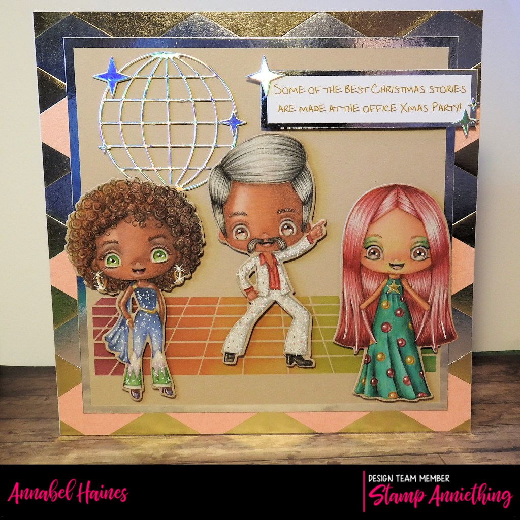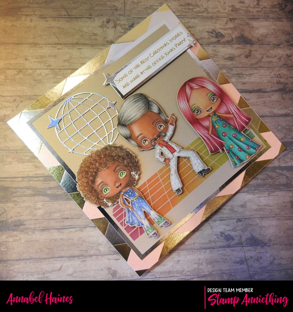 Everyone knows that the stories from the Office Christmas Party can completely overshadow the traditional Christmas tales, don’t they? I thought the new disco crew from Stamp Anniething looked like members of the most awesome works party, encouraging their co-workers to really take on that Yuletide theme! This is Donna Dancing Queen, Jackie Foxy Mamma and Gary Casanova.
