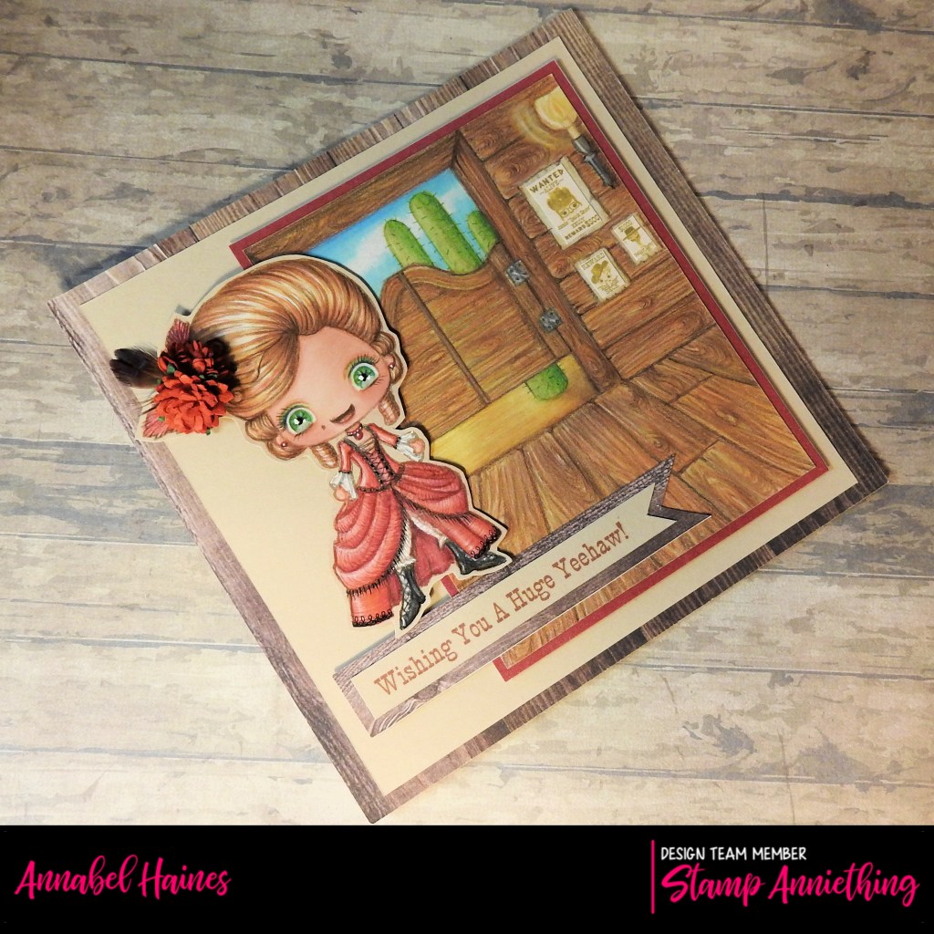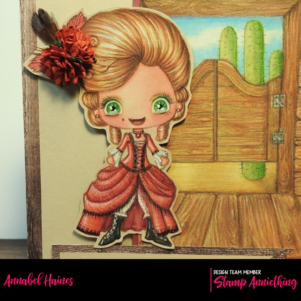 In it my main aim was to do a combo stamp, mixing the top part of the Queen stamp with the legs of the King stamp to make a Western/Cowboy Bar Girl! And as she needed a setting, we chatted about using wood textures to make a background.