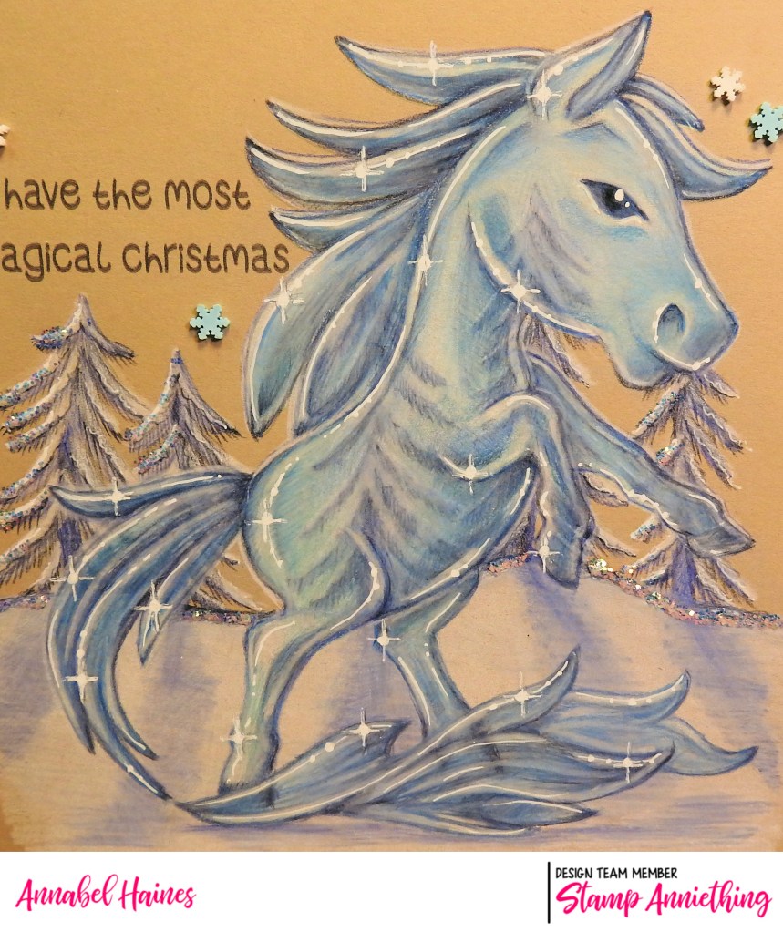 Not sure I need to share my colour recipe, it was mainly 101, 120 and 140! I also used the Dark indigo for my extreme shadow colour. When I coloured the horse, to make him slightly different from the background, I added in a bit of a more turquoise tone.