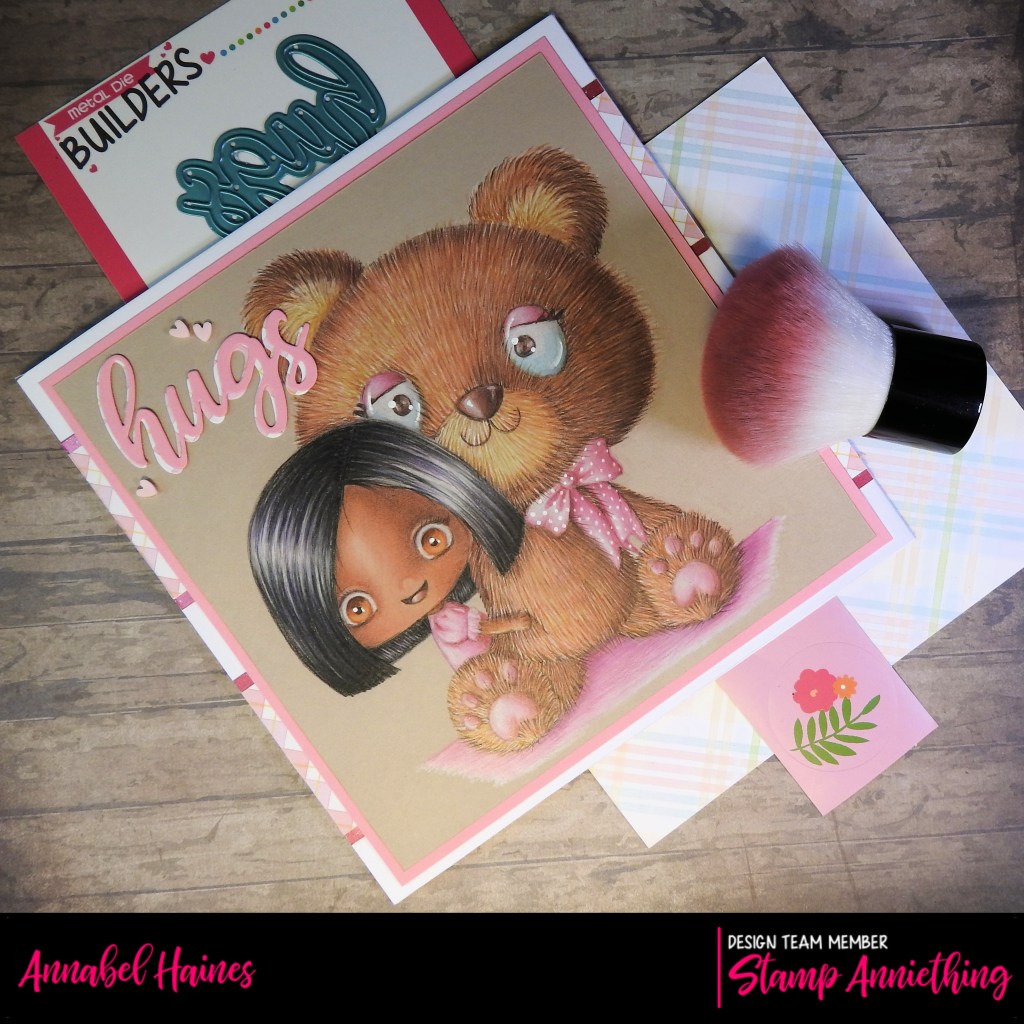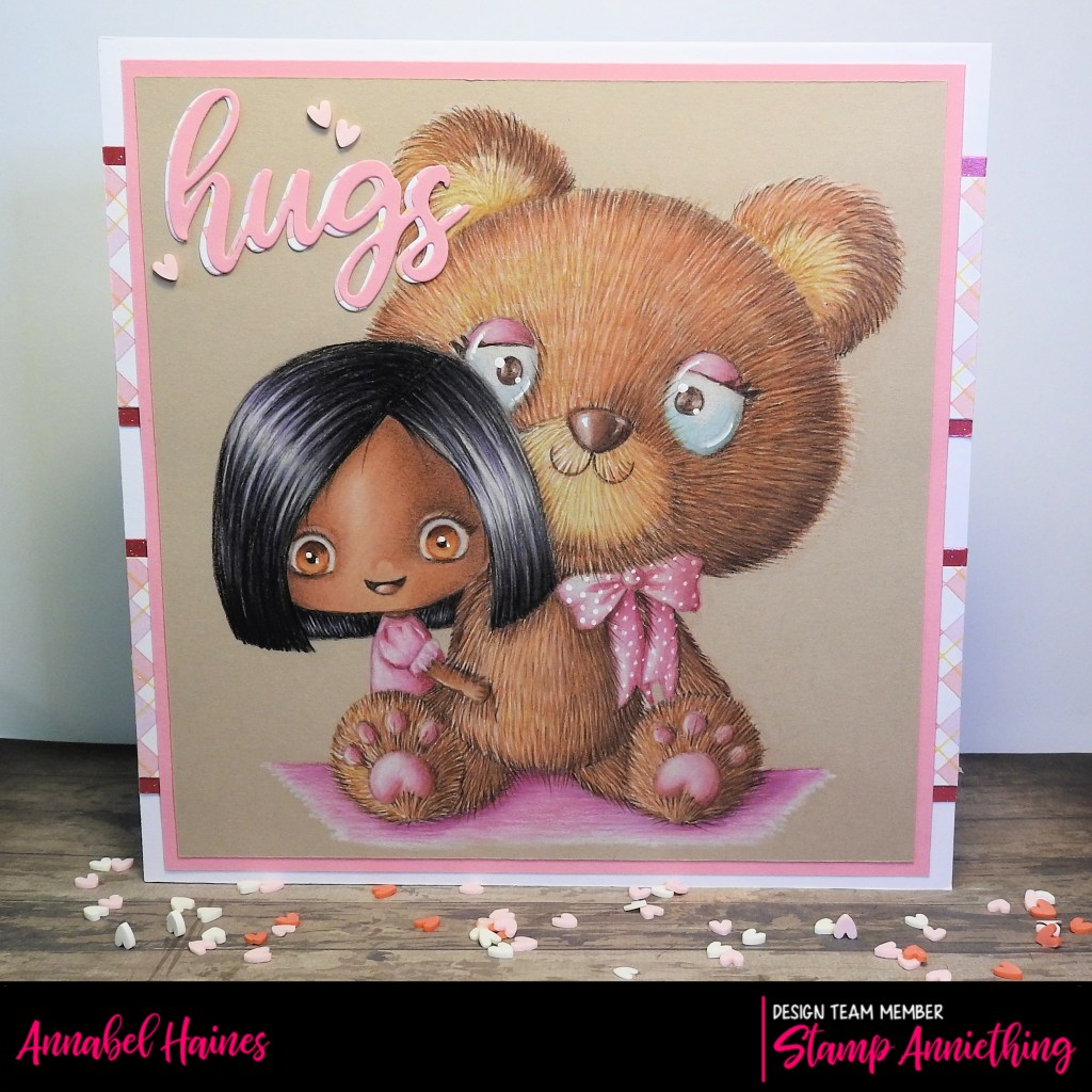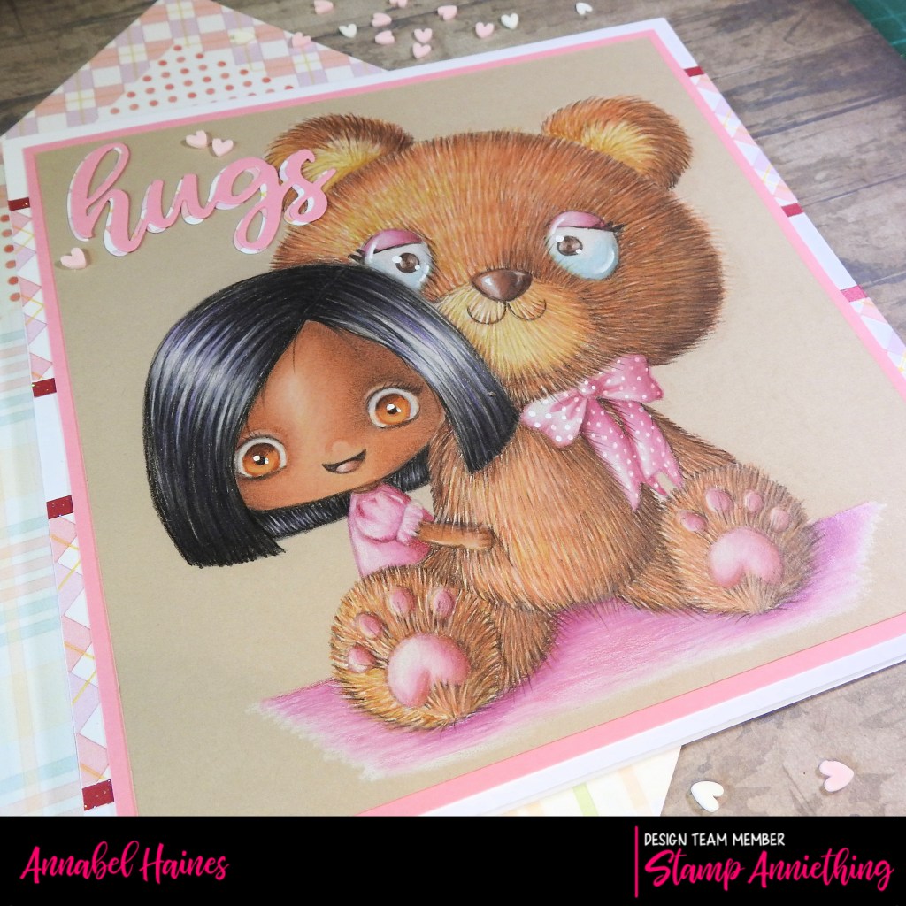 I decided to make her up into a simple card and added a die-cut “hugs” in two papers, one pink and one a patterned piece from the Welcome Spring 6×6 Pad. For a bit of embellishment I added a few pink hearts from the “heart sprinkles” also from Stamp Anniething. (There are loads, have you checked them out? You can make your shaker cards beyond awesome!)