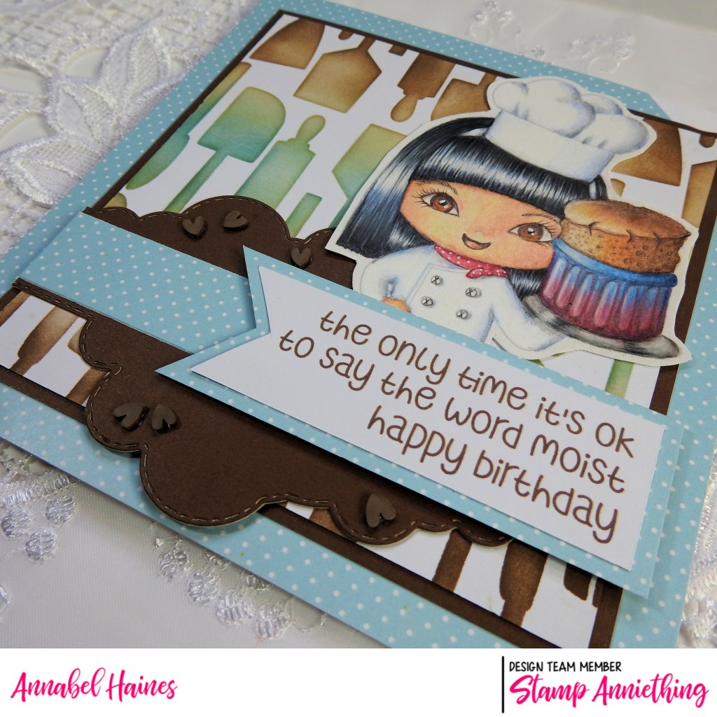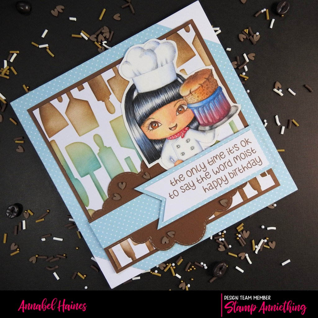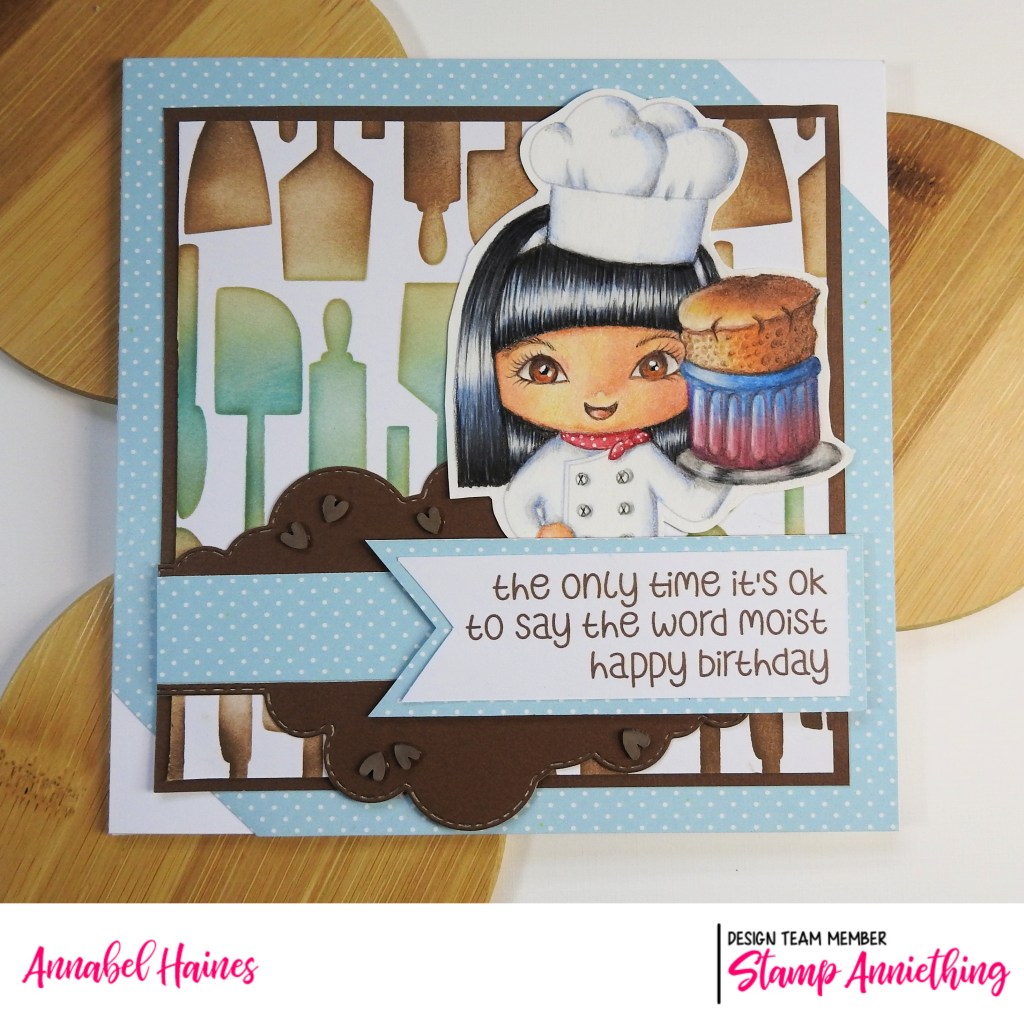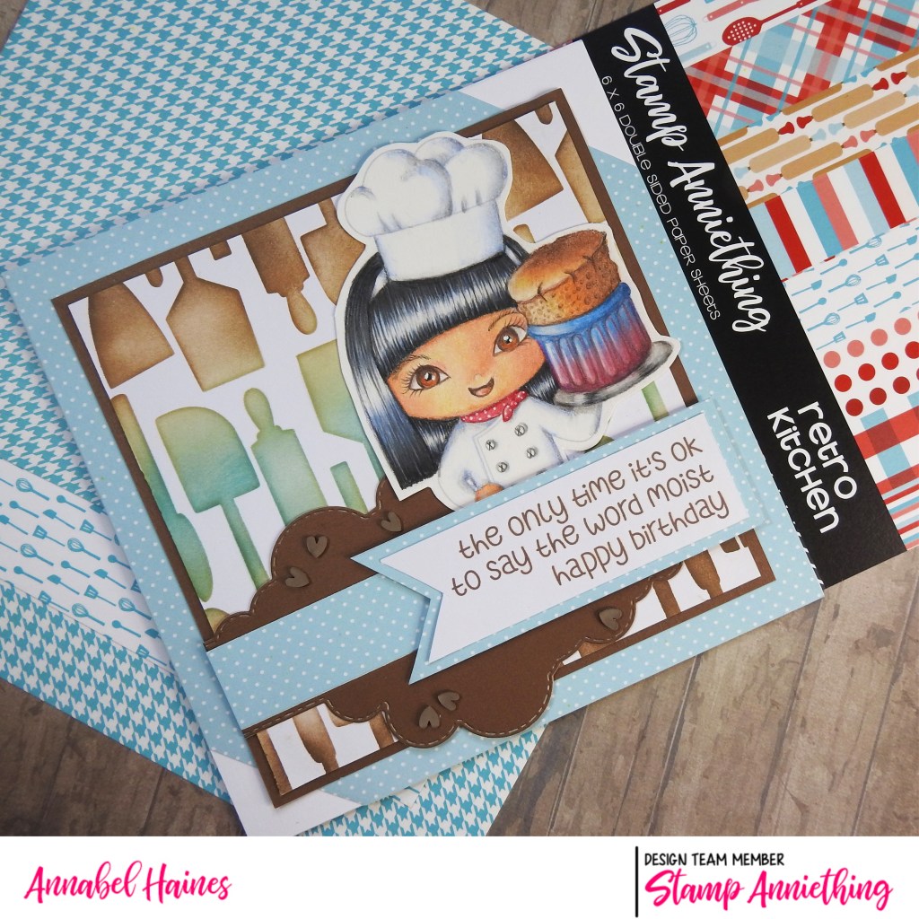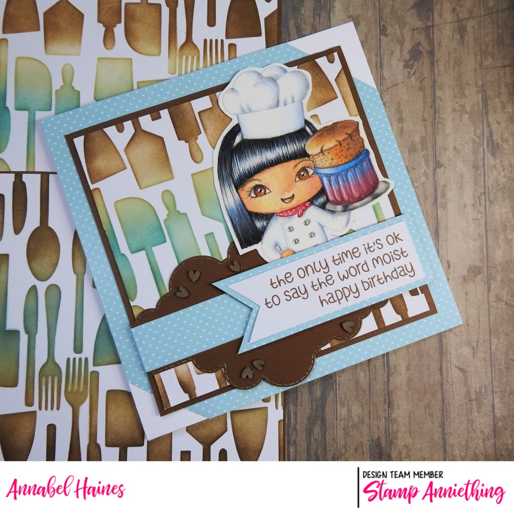 I use quite a few Stamp Anniething products when I make up the card, remember you can get a discount on those products once you have registered for the course (or if you have already subscribed, from the renew date at the end of the month). For the background of my card I used Stamp Anniething Hybrid Inks through the newly released “Utensil Stencil“. I dunno why but that made me chuckle, we like a good rhyme, lol. The stencil would team up great with the Retro Kitchen Paper Pack, I used some blue spotty paper from it for this make, but it’s got some super patterned papers that match this theme and stencil so well!