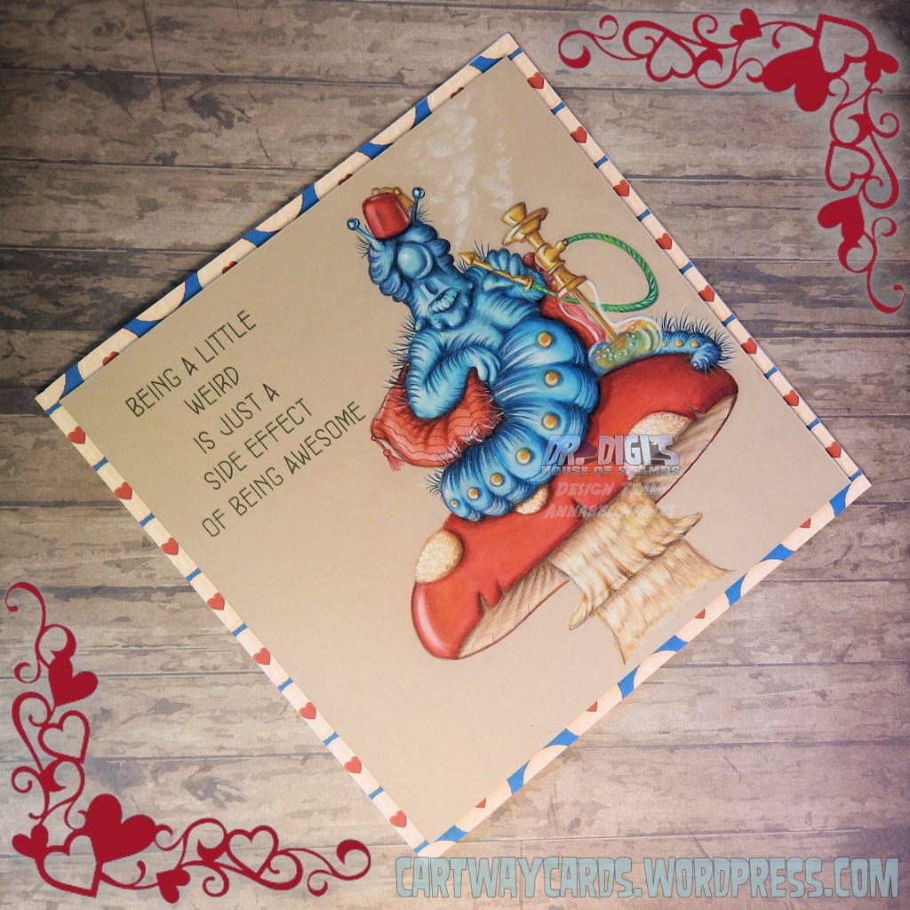 I was inspired by some of the older illustrations of the caterpillar in the Alice story books to colour him blue.