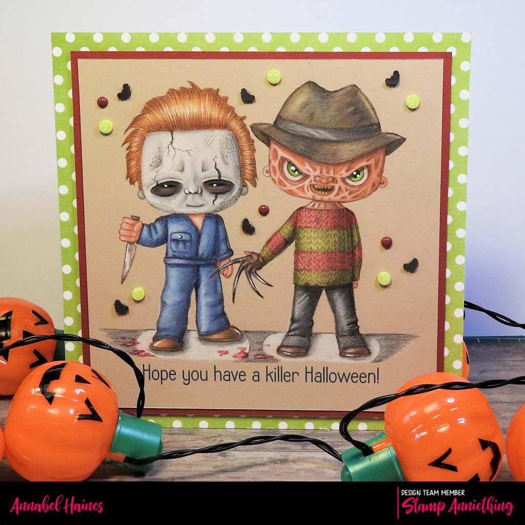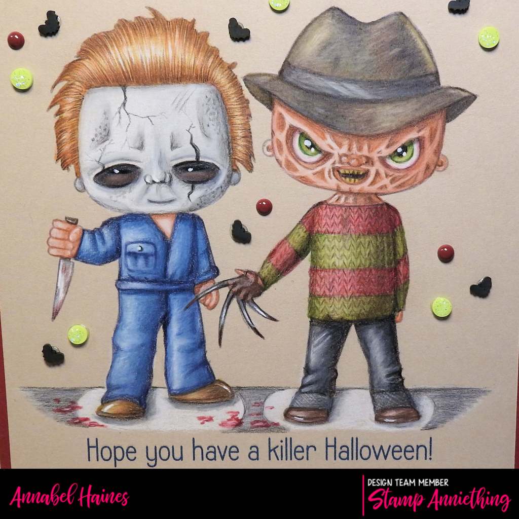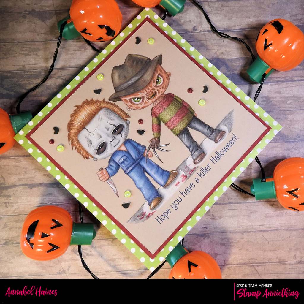 It’s another Stamp Anniething Monday post and I decided to combo two of the new Halloween digis today and make them into a menacing pair 😀 I love colouring up Halloween themed things, tho I fully admit I don’t know when to stop with gory details lol. This is Dream Big Freddy and Love Family Mike