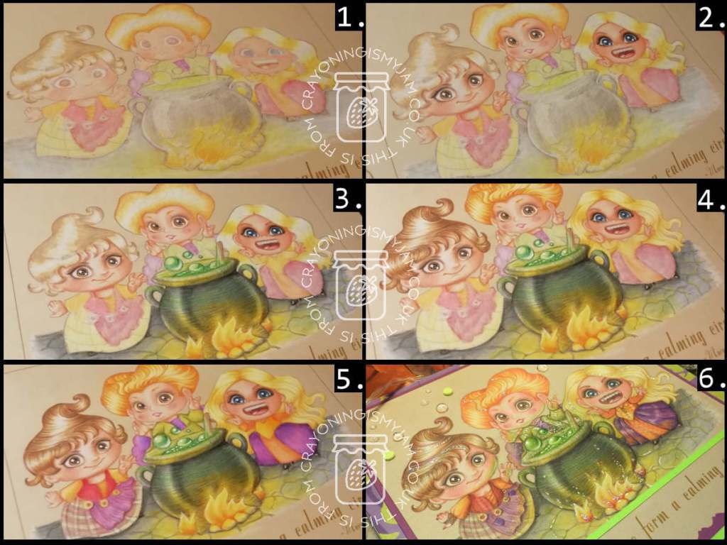 I also wanted to show you some progress pics, and you can see the layers of colouring as I progressed below. 1 shows mapping out my colours, 2 is faces, 3 is the cauldron, 4 is hair, 5 is clothing and patterns and 6 the finished card.