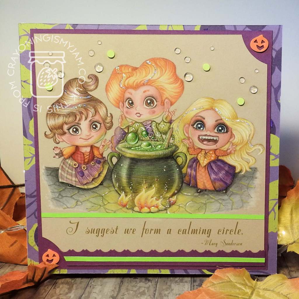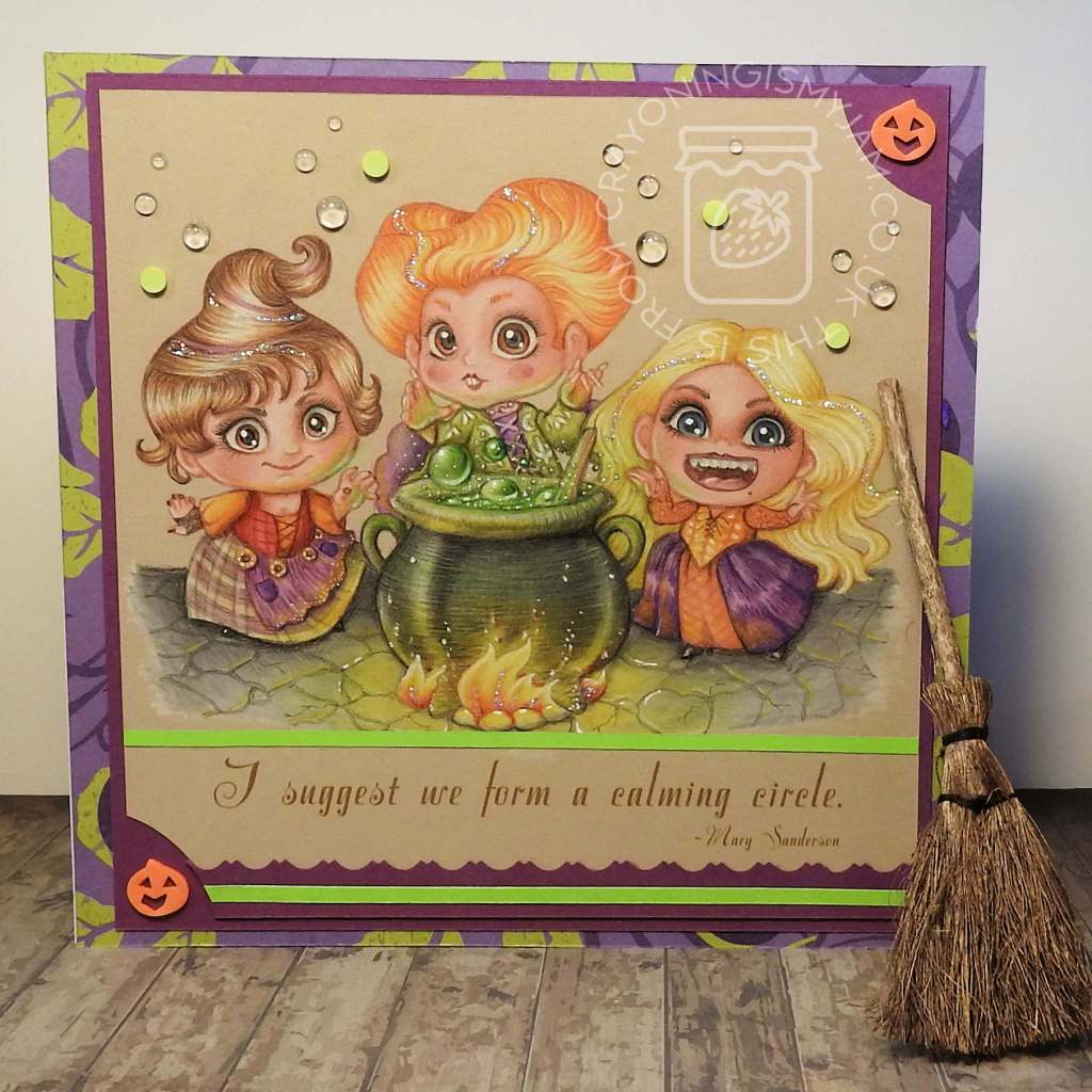 I used some stash papers to make up my card and lot of embellis to represent the magical liquid in the cauldron, plus some stickles in their hair!! The clay embellishments I used are from Stamp Anniething. (Fright Night and Don’t Bat and Eye)