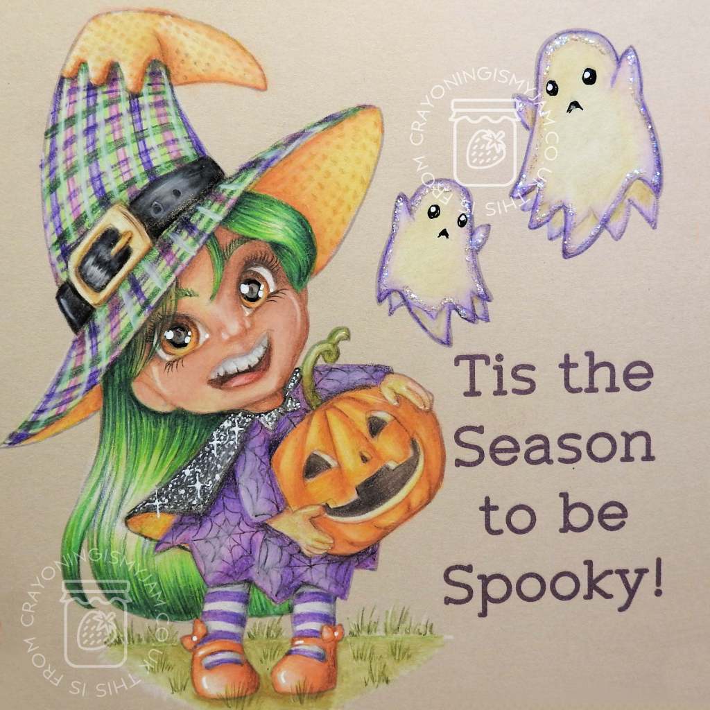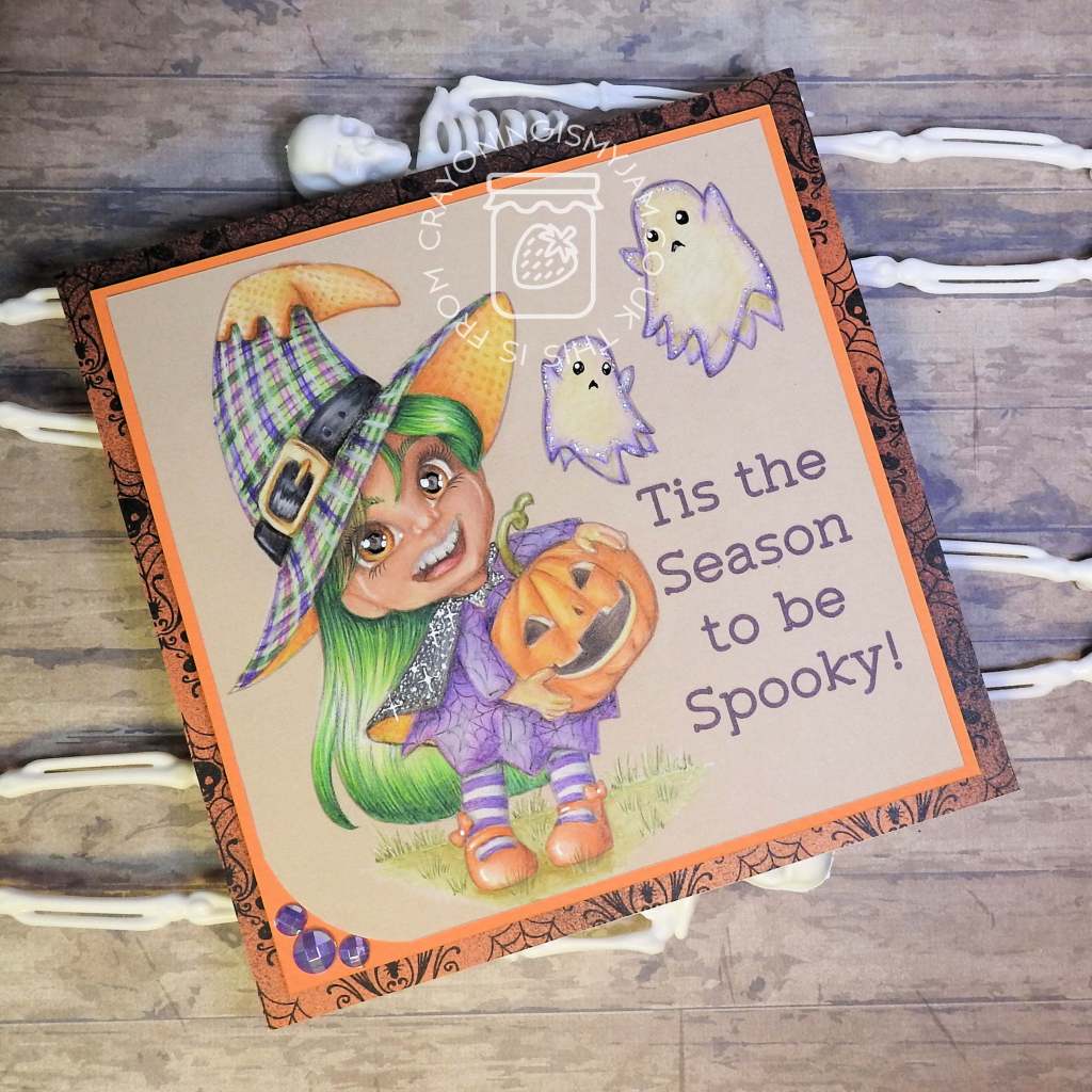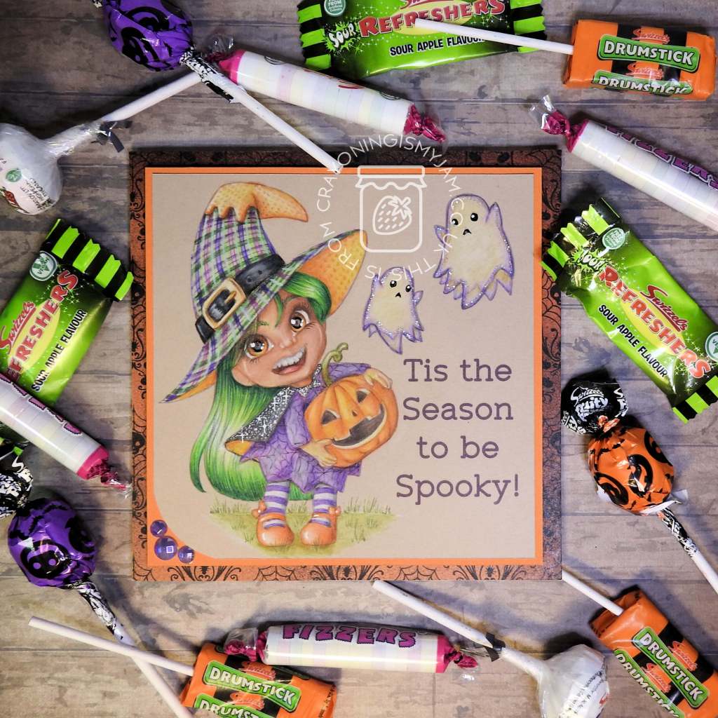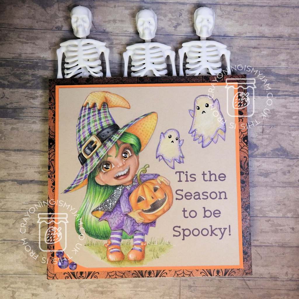 I used orange backing paper and some patterned paper from the stash (Thanks Amy HP for the halloween 6×6’s they have lasted me very well!) to matt&layer behind her and some bling from the stash in one corner. (Bling was actually from B&M, if you are a UK person?)