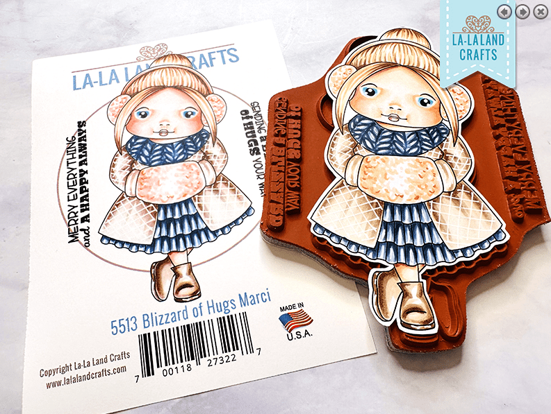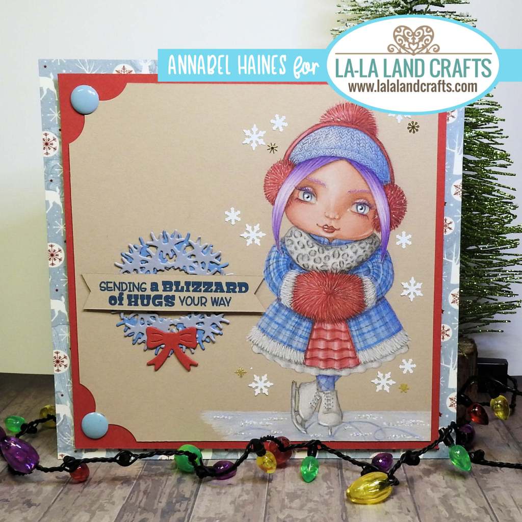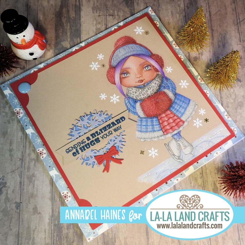 I selected two figure stamps (Marci and Luka) and some lovely bear stamps to work with! But I am going to start with Blizzard of Hugs Marci. She was lovely to colour up, here is the card I made using her –
