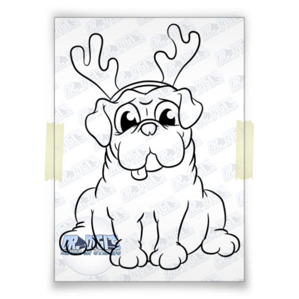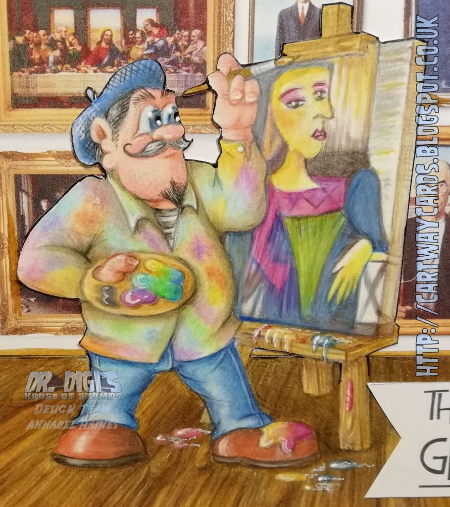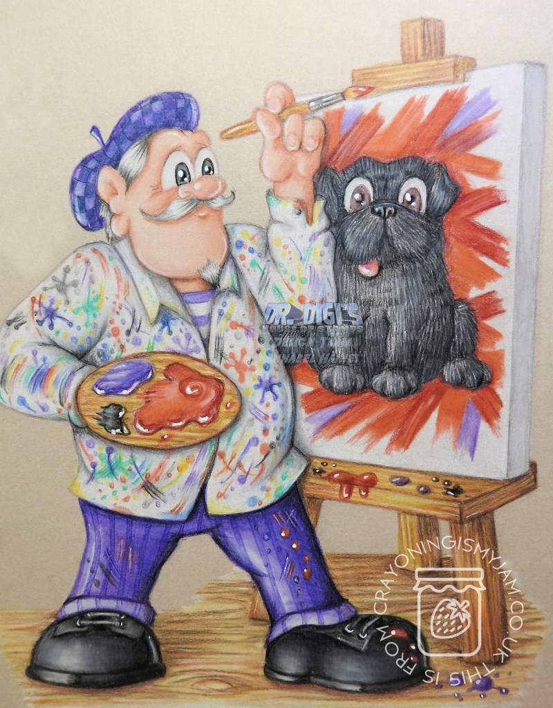 An increasingly rare event, a commissioned card! This is Pablo the Painter, and I have coloured him up whilst he is working on a portrait of Pugsley! (I removed Pugsley’s antlers as it wasn’t a christmassy theme!)