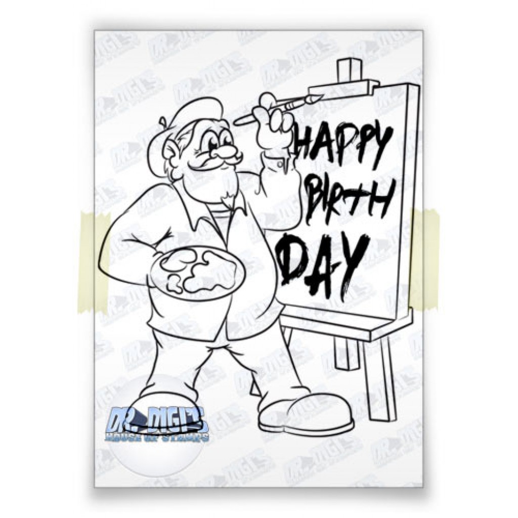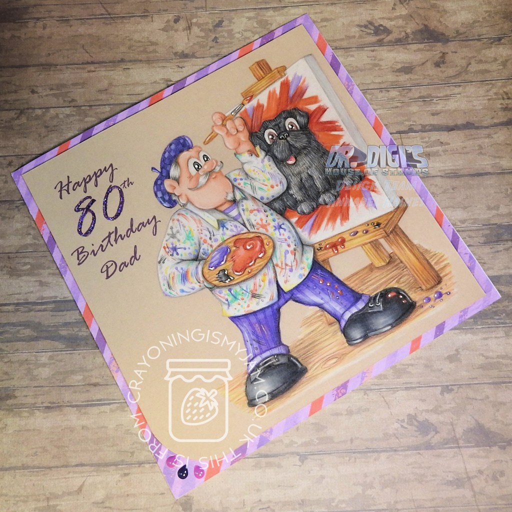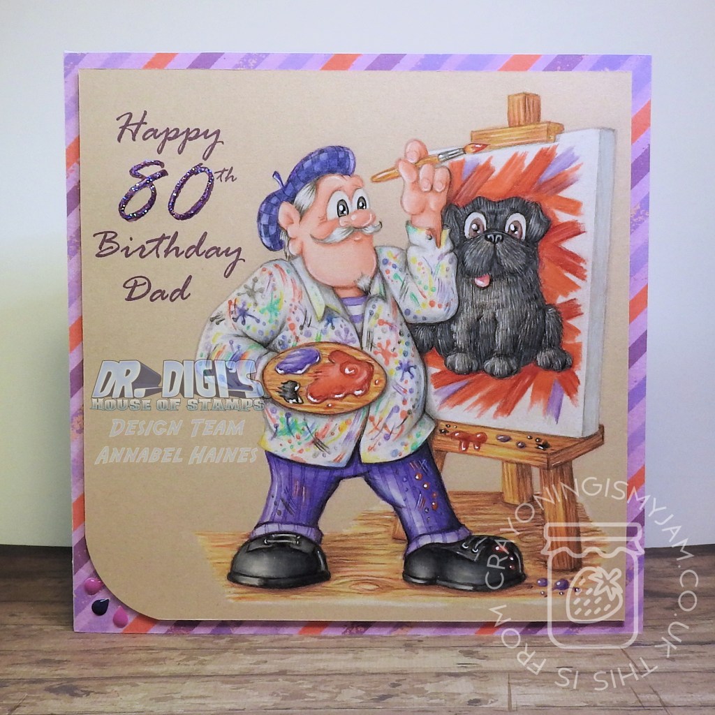 I really wanted to make his smock look splattered this time, rather than just a painterly mess, I am not sure I achieved it, but it was a fun overall look! Once it was all made up I added some stickles glitter to the “80” and some splashy bling in one corner.
