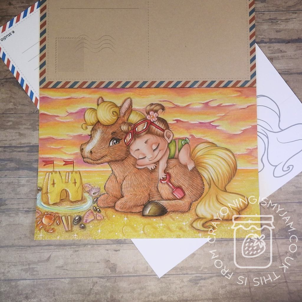 I enjoyed adding the sunset sky and sand castle Lola had made earlier in the day, before napping on her pony 😀