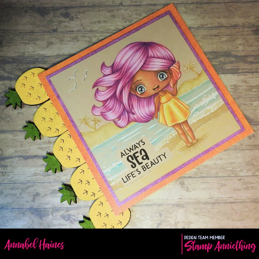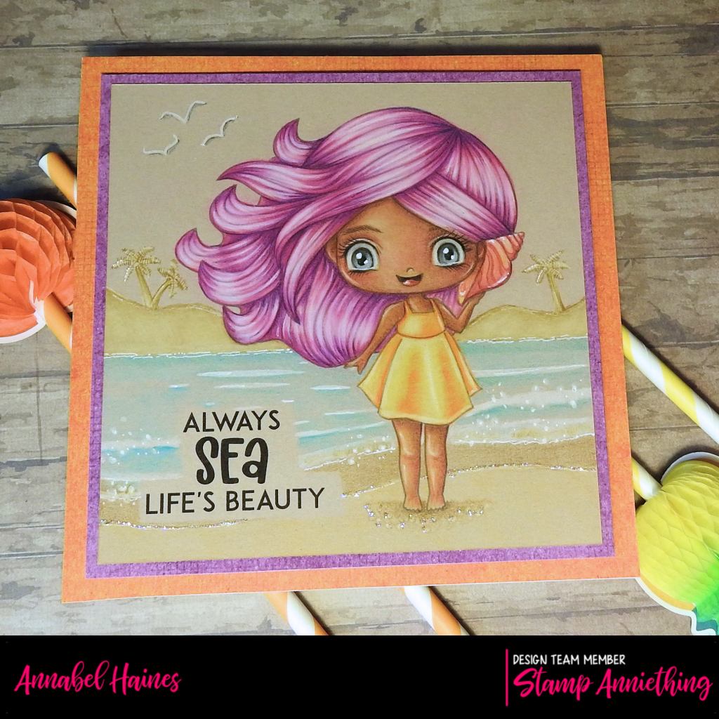 Hey All! I am in a beachy waves kinda mood (rather than damp frizz) so I decided to snag the “Always Sea Life’s Beauty Digistamp” and make up a simple stencil-pencil background for her! (This Digi is from the Stamp Anniething Summer Event earlier this year)