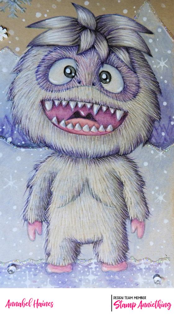 And here is what a my yeti looks like, close up! I also used two snowflakes from the set! I have coloured him and the background with Polychromo Pencils and I also used a White Posca Pen. The paper I am using is Kendal Manilla Buff.