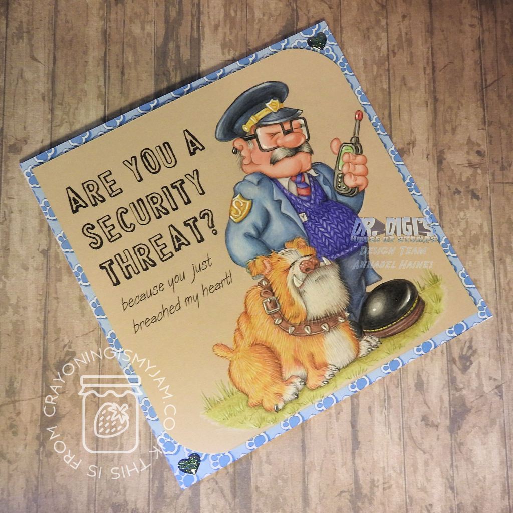 To make up my card I created my own sentiment to print with the digi on my topper. The fonts I used are Cheapskate Outline and Copa Sharp BTN. For my background I printed a blue version of the Paw Prints paper straight onto 300 gsm cardstock to make a patterned card base.