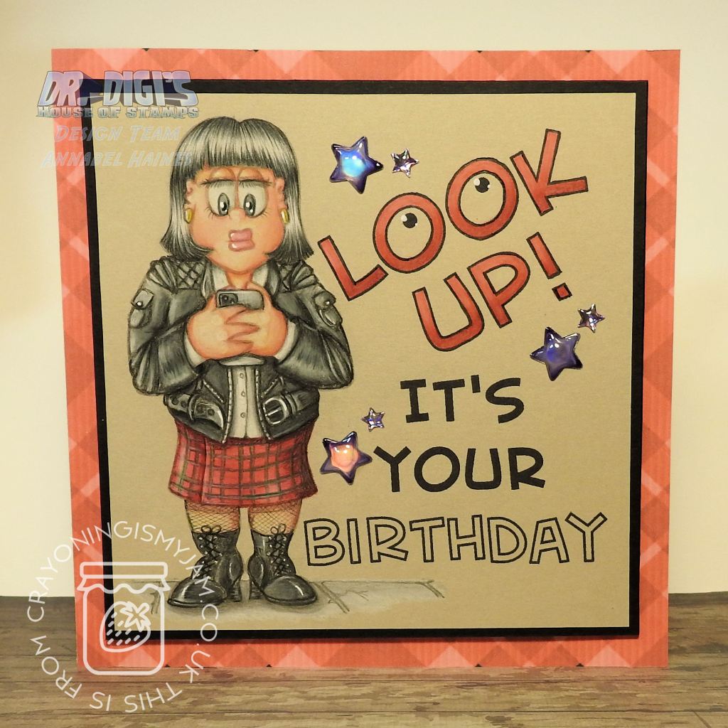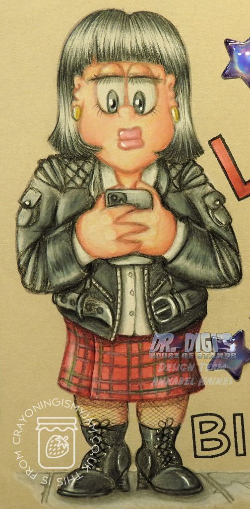 Bus Stop Beth from Dr.Digi’s with her nose buried in her phone! Thought I would update Beth and make her all about her phone, rather than her being at the bus-stop! You can see all of the Bus Stop Bunch together on this stamp here.
