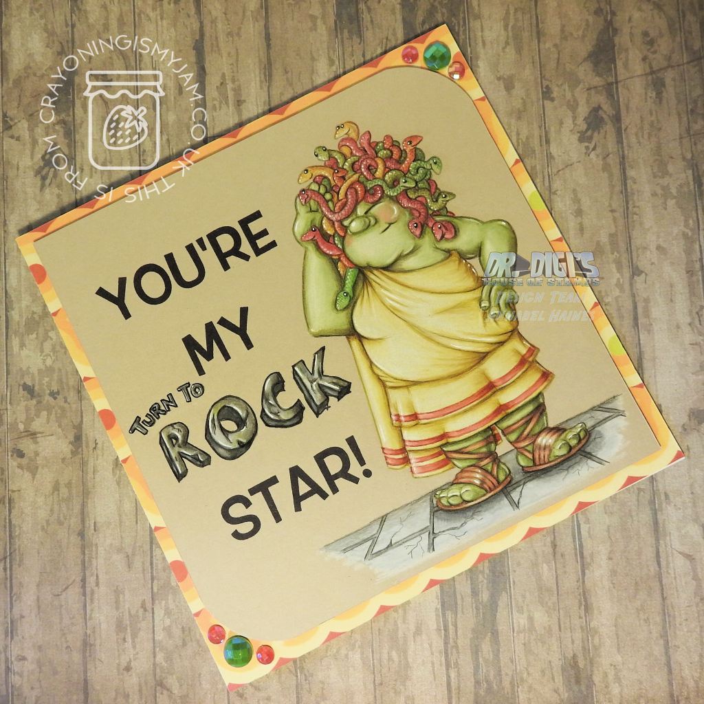 I finished my card with some rounded corner scissors and then some bling from the stash! I decided it has a rather pizza-like aesthetic, lol! See you soon for more crayoning! 😀