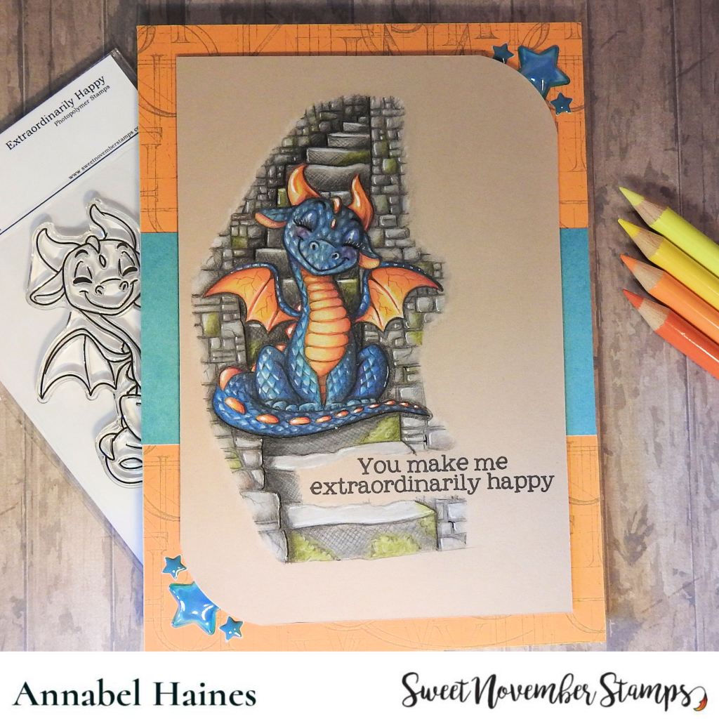 I love colouring dragons, so many excuses for playing with colours and textures! I also got a bit obsessed colouring the background and got in a mindfulness zone adding bricks, lol! I used the digital background builder Haunted Staircase.
