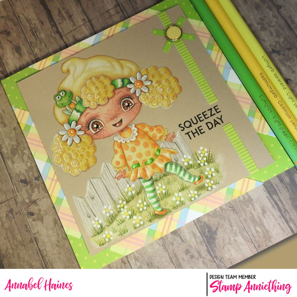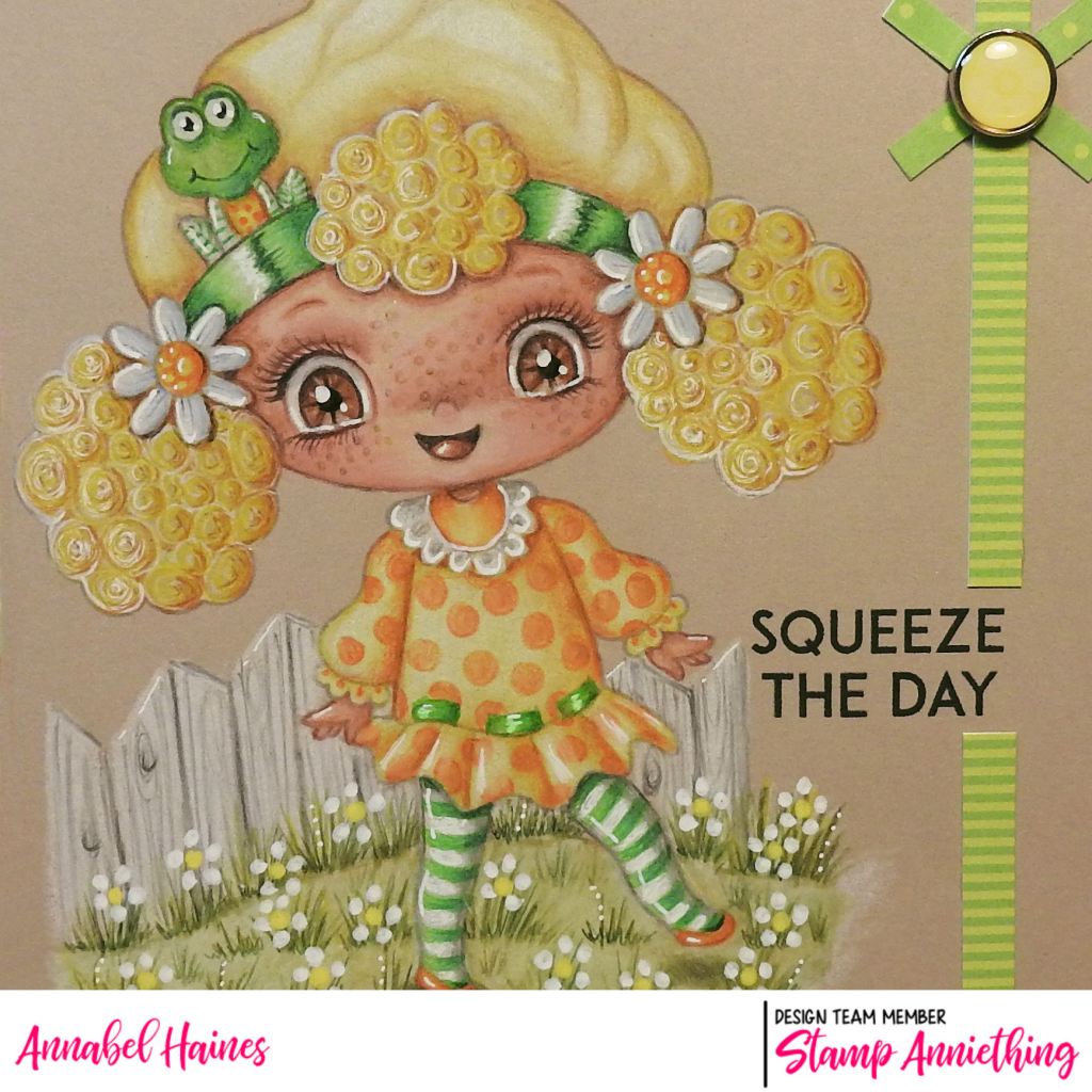 I used Kendal Manilla Buff to colour onto as normal, with Polychromo Pencils. I added highlights using white posca pen too. The papers are from the Welcome Spring and Stripes and Dots 6×6 Paper pads. Ye olde brad from the stash 🙂