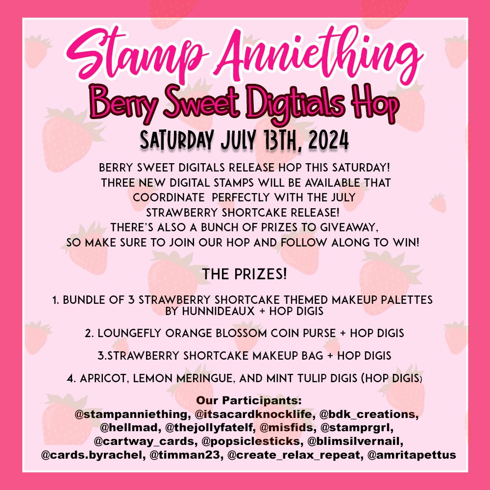 Hi! I am taking part in the Stamp Anniething Berry Sweet Insta Hop today! Three new digital images have been released to go with the Clear Stamp Set of Strawberry Shortcake!