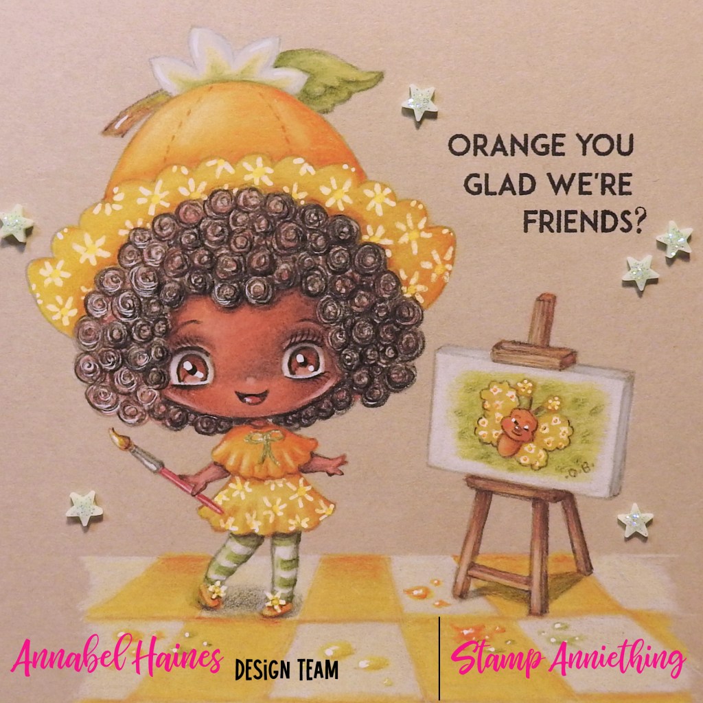 And this is a close up of my version. Apparently she is very artistic, so I got her painting up Marmalade on canvas and popped a brush in her hand! I used polychromo pencils on Kendal Manilla Buff Cardstock.