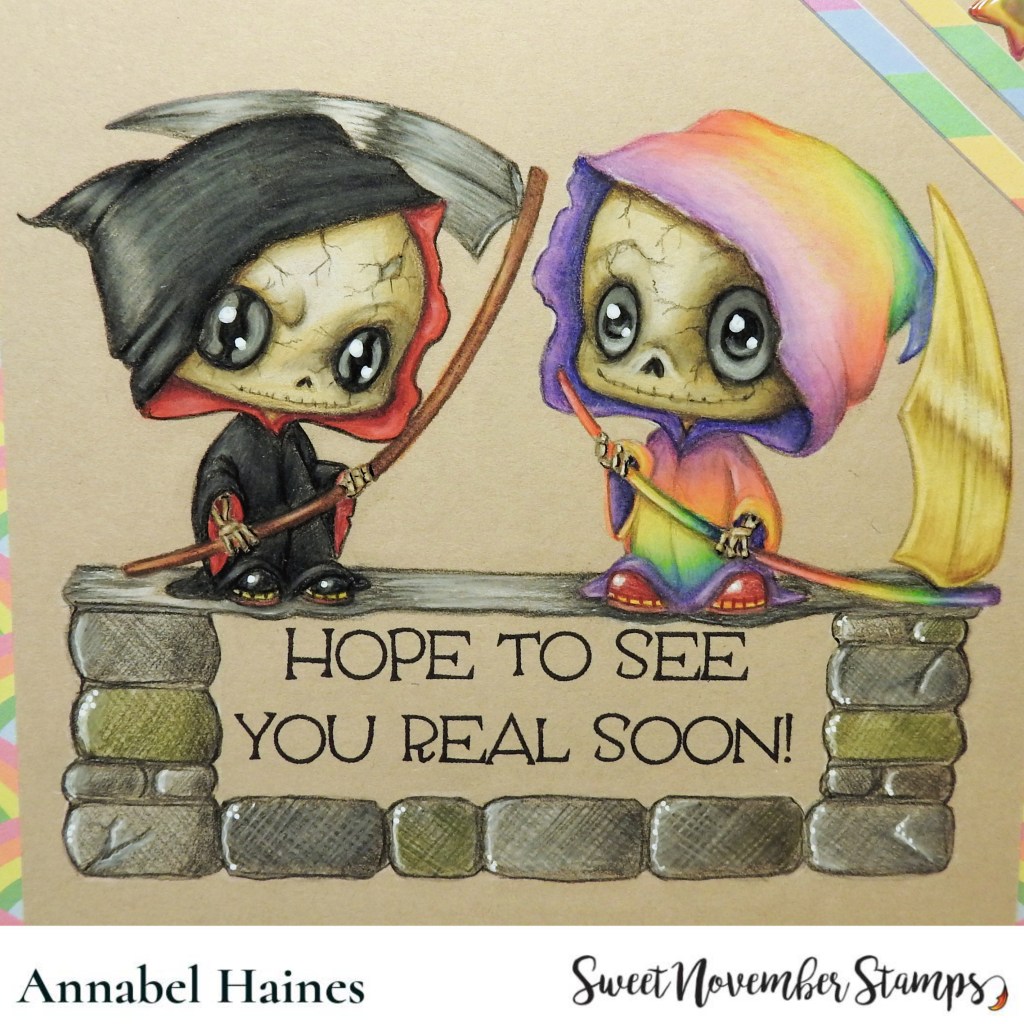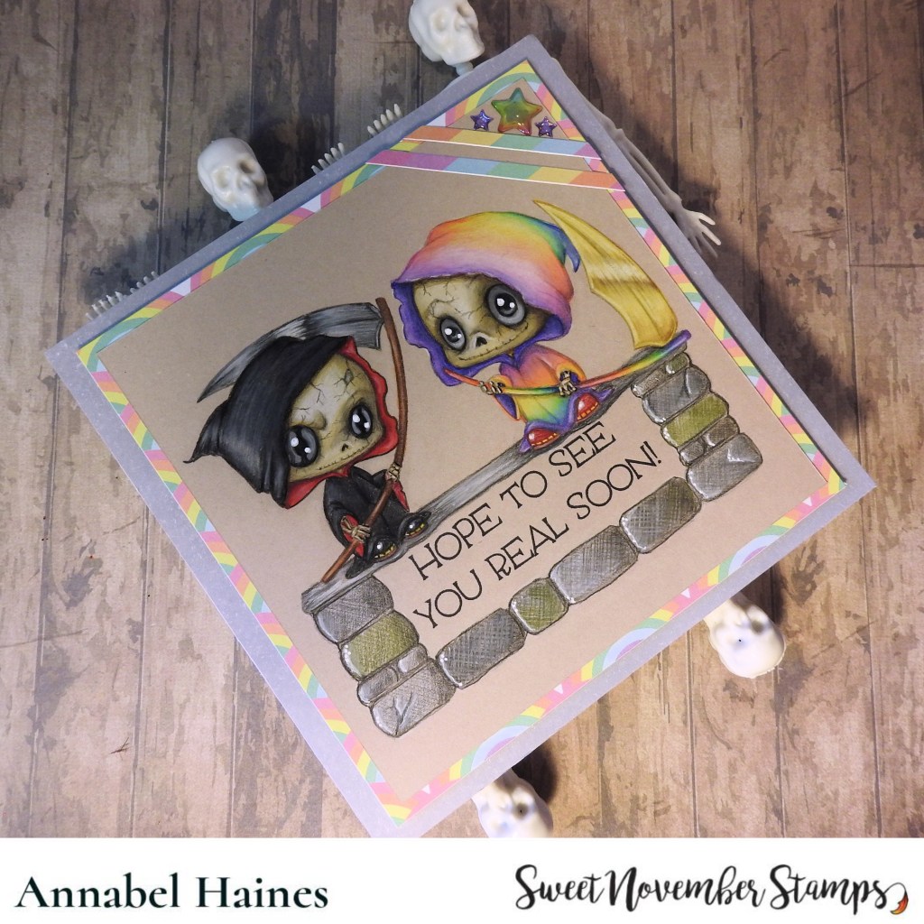 I took a sentiment from the new Lil Grimmy set and stamped that beneath them. I decided to free-hand some stonework around the sentiment afterwards!