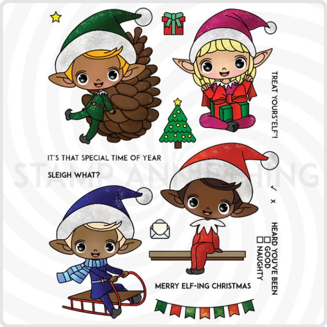 …..late Christmas make? This is the fabulous Treat Yours’Elf 6×8 Clear Stamp Set from Stamp Anniething!