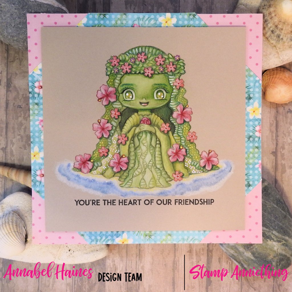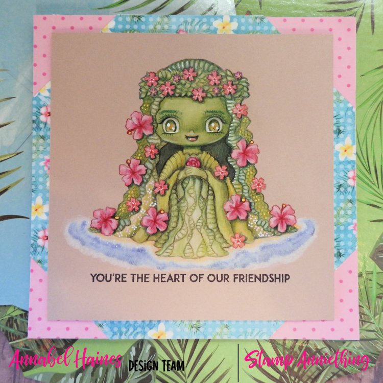After I took my photos I decided she could do with some sparkle, so I add stickles glitter to the edge of the tide/beach. The hibiscus flower is included in the stamp set, I free-handed the frangipani flowers to match the ones in her head dress.