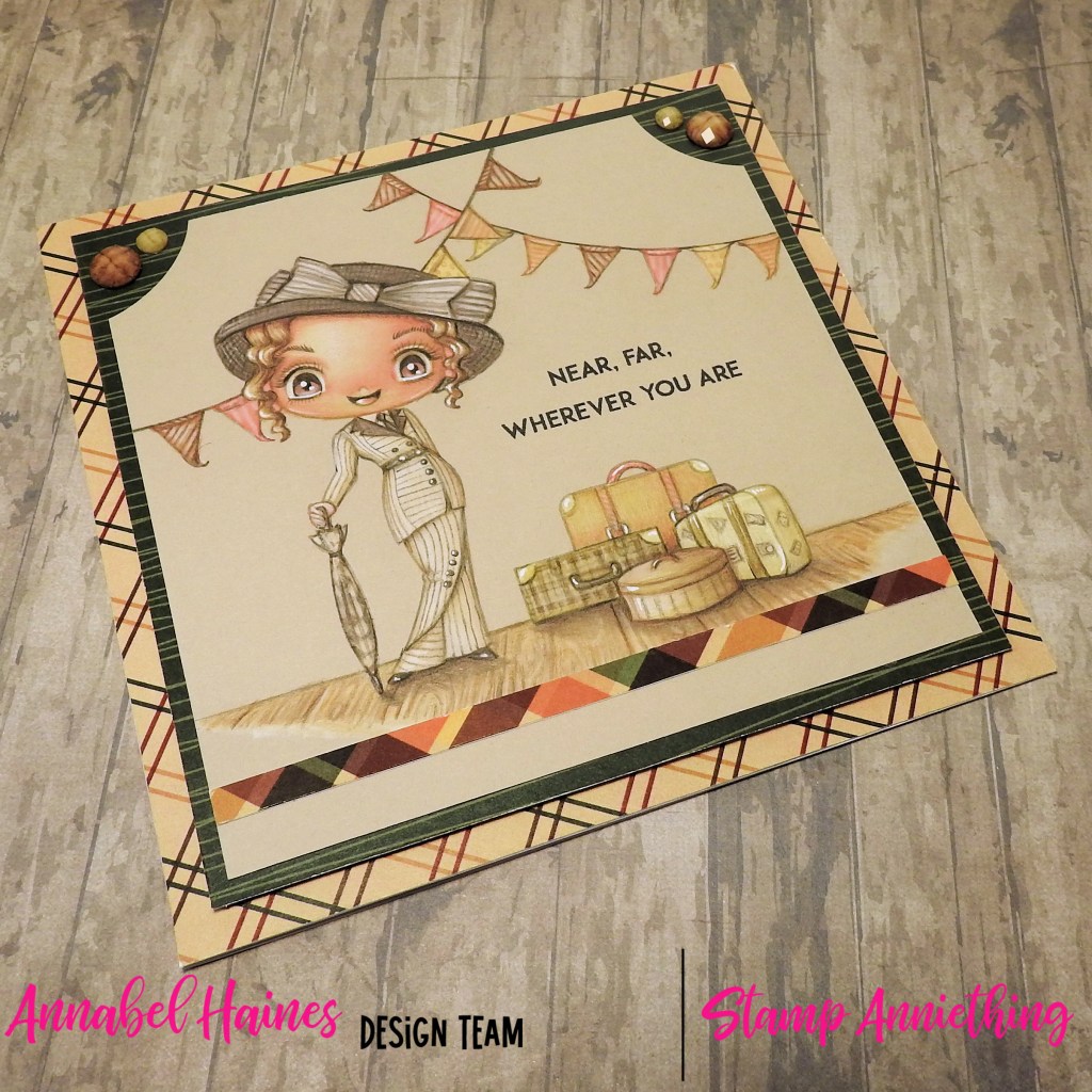 Here is a close up of Sepia Rose. I used Polychromo Pencils on Kendal Manilla Buff. I also used a white posca paint pen. Suitcases and sentiment are also in the set. I enjoyed creating her striped outfit, and yes, I went to find a good pic of it to use as reference whilst I coloured her! It’s fine to print out reference pics, lol!