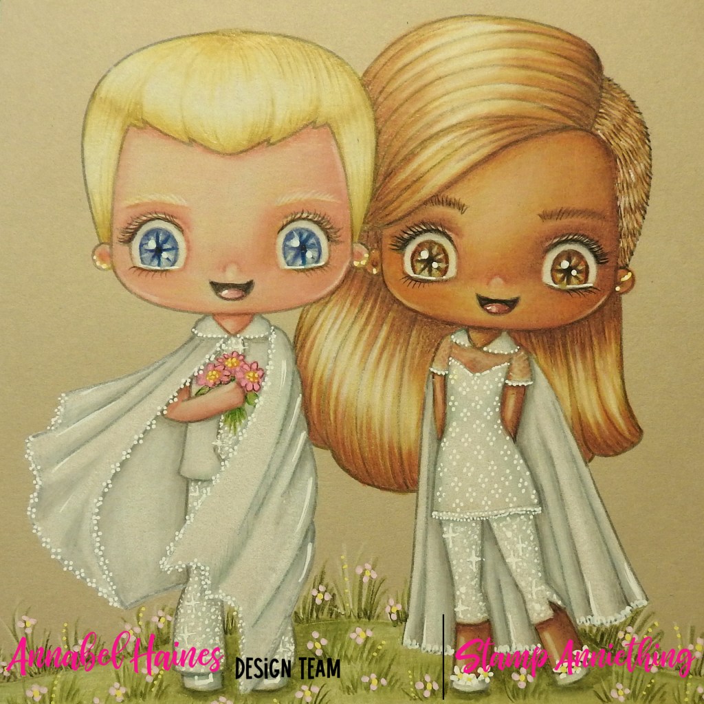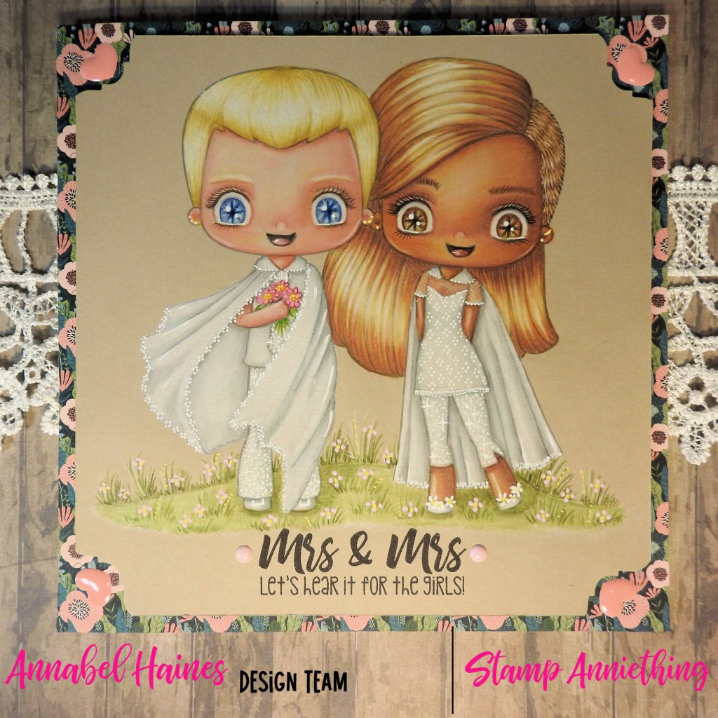 Time for a Wedding Congrats card! And as the Pride Digistamps at Stamp Anniething are currently being offered to support an amazing cause, I am using the Siv and Elle digistamps for this one. Siv and Elle were previously released in support of Pride – June 2021, there are new digis for 2025 too! Go check them out!