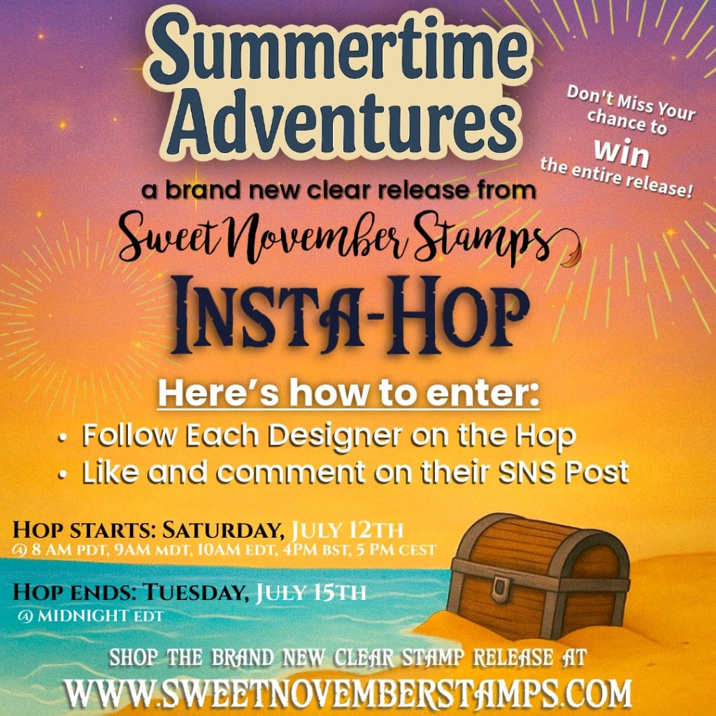 Official blurb – Your summer of stamping magic starts here with the Sweet November Stamps Summertime Adventures clear stamp release! Featuring ten brand-new sets that whisk you away from sweet summer fun to high seas adventures — plus three coordinating sequin mixes — this release is your passport to a season full of creativity. Get ready to embark on a crafting journey like no other! Want to WIN the entire release? Join our Insta-Hop with our amazing Sweet November design team! Here’s how to enter: – > Follow each designer in the hop – > Like and comment on their SNS post Hop starts: Saturday, July 12th Hop ends: Tuesday, July 15th Winner announced: Wednesday, July 16th