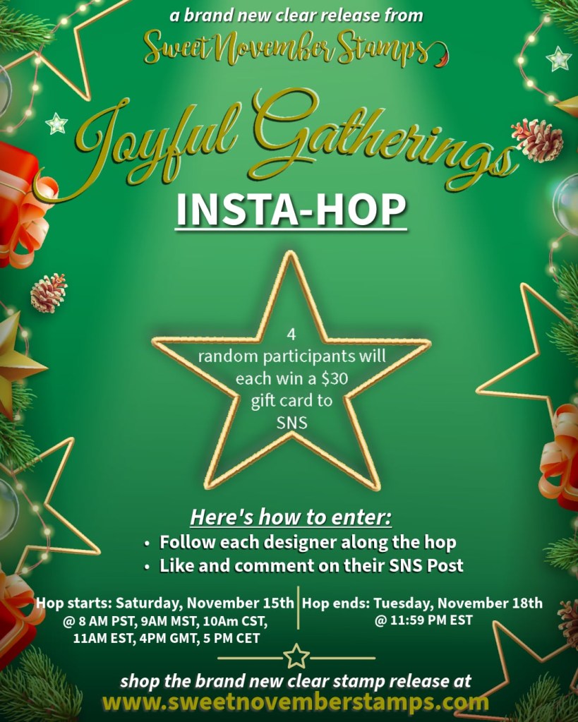 The holiday sparkle is starting to twinkle, and we’re so excited to share that Sweet November Stamps is kicking off the season with our Joyful Gatherings clear stamp release! This collection features 11 festive stamp sets, two charming Birthstone Dragons, and three new sequin mixes that will have your holiday crafting glowing with joy. To spread even more cheer, we’re hosting a Joyful Gatherings Insta-Hop with our amazing Design Team! And guess what? Four merry makers will each win a $30 Sweet November gift certificate! How to Enter It’s simple, just visit each designer’s account listed below 1. Follow them 2. Like and leave a comment on their Joyful Gatherings SNS post You’ll have Saturday, Sunday, Monday, and Tuesday — November 15th–18th — to hop along. The four random winners will be announced Wednesday on the Sweet November Stamps Instagram page.