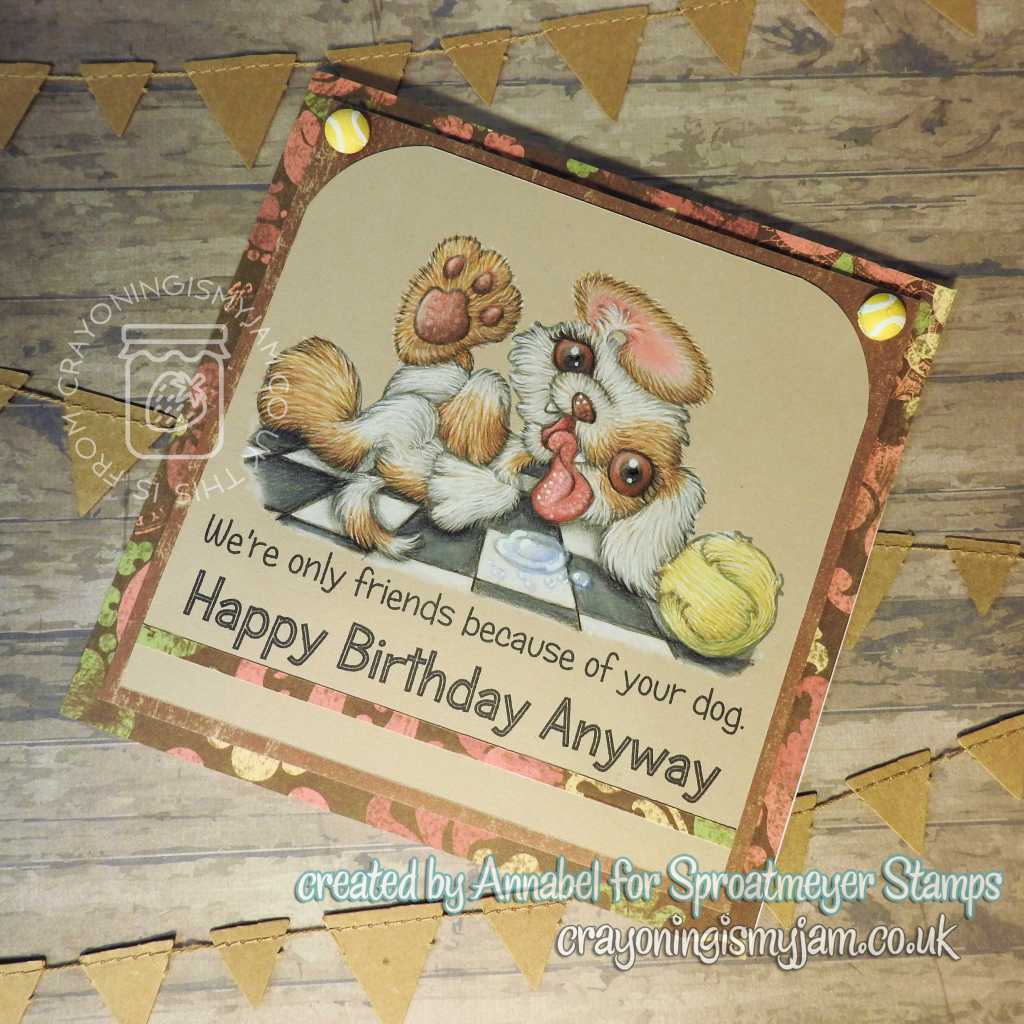 Yes, focus! So here is my new card featuring the lovely Dog with ball from Sproatmeyer Stamps! Isn’t he a cutie? Also, inside out ear! Don’t think I have ever coloured one of them before?!