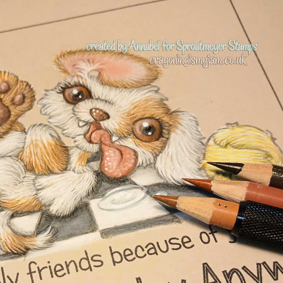 I think he would be easy to kind change up if you’d like, less drool, less ball, and the ear whichever way round you’d like it? You already know how much I love colouring fur and very much dogs, so this was super fun to colour. Also I am still on my “use the paper stash” mission so this is ye olde papery, prob 20+ years old, yes, I am that old!!