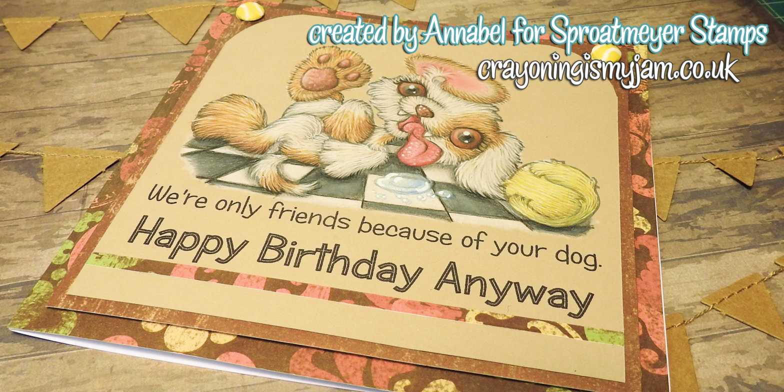 Yes, focus! So here is my new card featuring the lovely Dog with ball from Sproatmeyer Stamps! Isn’t he a cutie? Also, inside out ear! Don’t think I have ever coloured one of them before?!