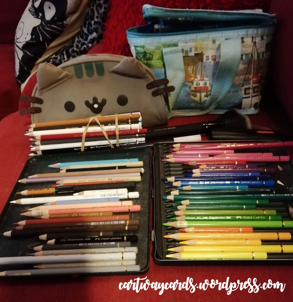 Normally I colour in front of the tele in the evenings with my pencils laid out beside me. Sometimes it is ambushed by an unhelpful cat who insists that plonking his bum down in the middle of the tin IS SUPER COMFY. It is lies.