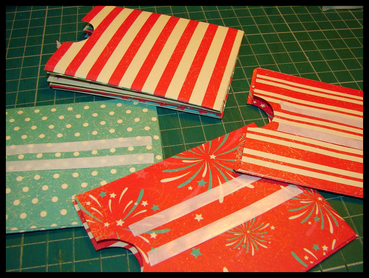 7. When they are all cut out I chose the order I wanted to attach them in. Then I added double sided tape to the middle/back of each pocket. Next stack them up and stick them down as squarely as possible.